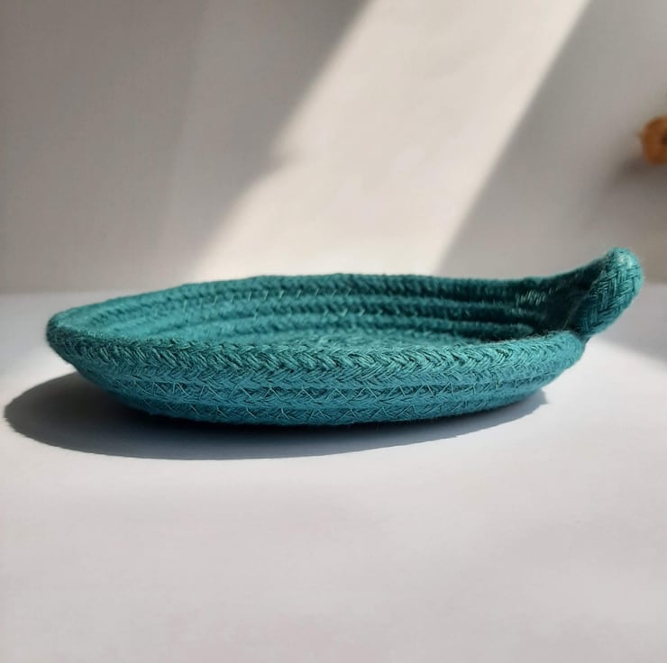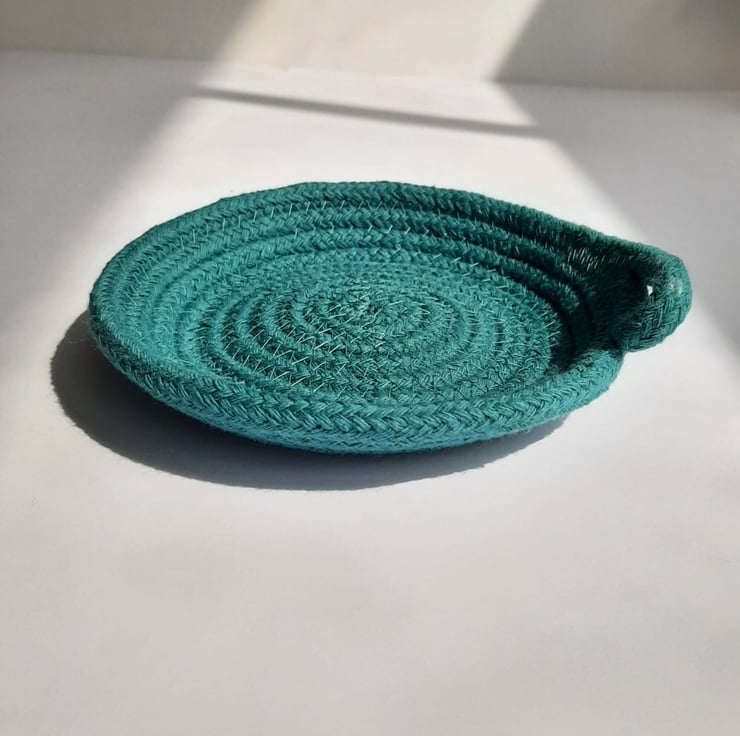 I have designed these little dishes to be a home for life's essentials. Each dish is handmade on my sewing machine from 100% cotton rope. These dishes are around 1" high and 5 - 5 1/2" high. I use a recipe for all of my designs but lots of factors; from the angle I hold the dish at as I form it to slight variations in diameter or softness of rope; can change slightly meaning each dish is unique.