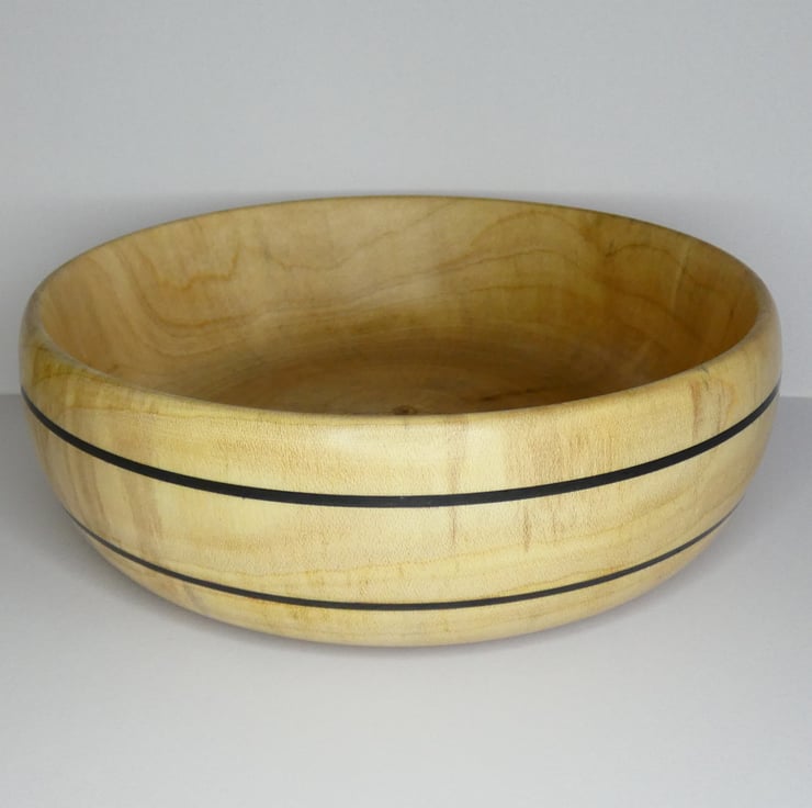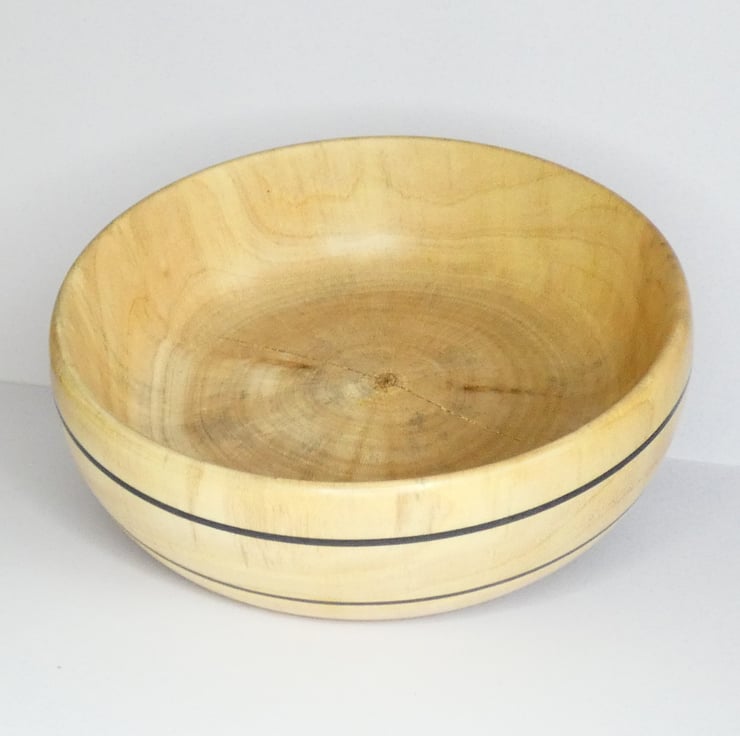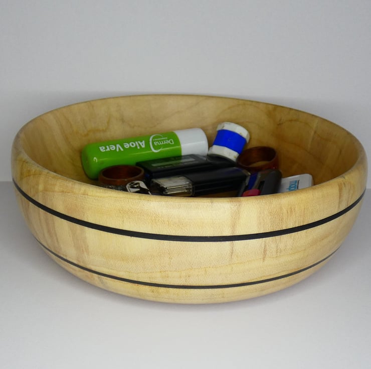 A piece of wood was selected then cut down to a suitable size to be woodturned. It was shaped on a woodturning lathe to a roughly finished final form before being sanded to a smooth finish. Two grooves were cut into the bowl then these grooves were filled with epoxy. The bowl is smooth to the touch and has been finished with several coats of Carnauba Wax. The Wax used is food safe. Any cracks in the wood are stabilised using superglue.