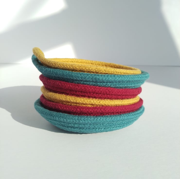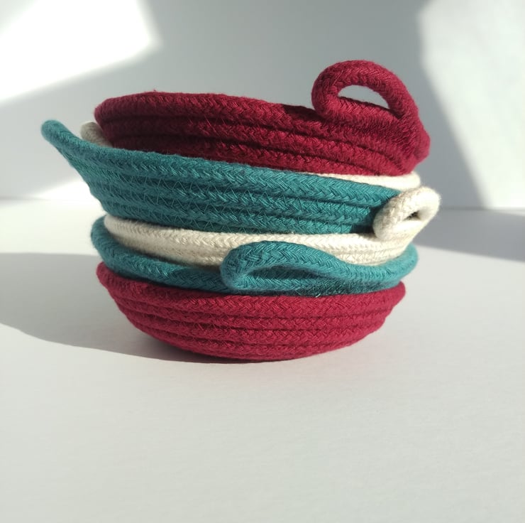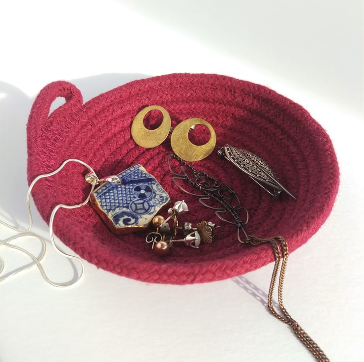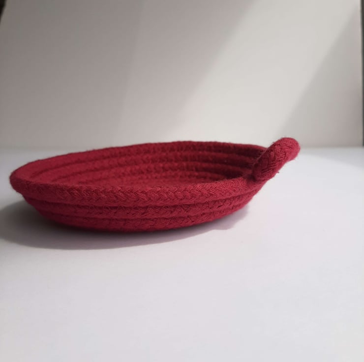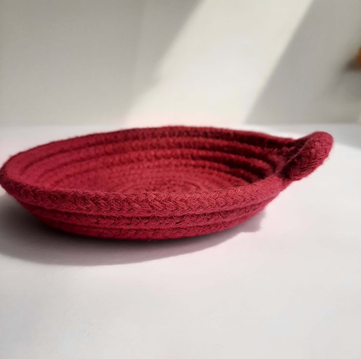 I have designed these little dishes to be a home for life's essentials. Each dish is handmade on my sewing machine from 100% cotton rope. These dishes are around 1" high and 5 - 5 1/2" high. I use a recipe for all of my designs but lots of factors; from the angle I hold the dish at as I form it to slight variations in diameter or softness of rope; can change slightly meaning each dish is unique.