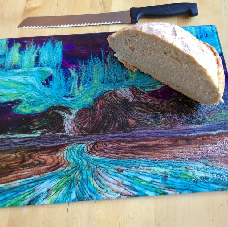 This unique glass chopping board has my textile landscape of the northern lights dancing behind a mountain, with the sea I front. The glass board is heat resistant, makes a perfect cheeseboard, work top saver and a stunning center piece for the table. Easily cleaned. Size A3 landscape.