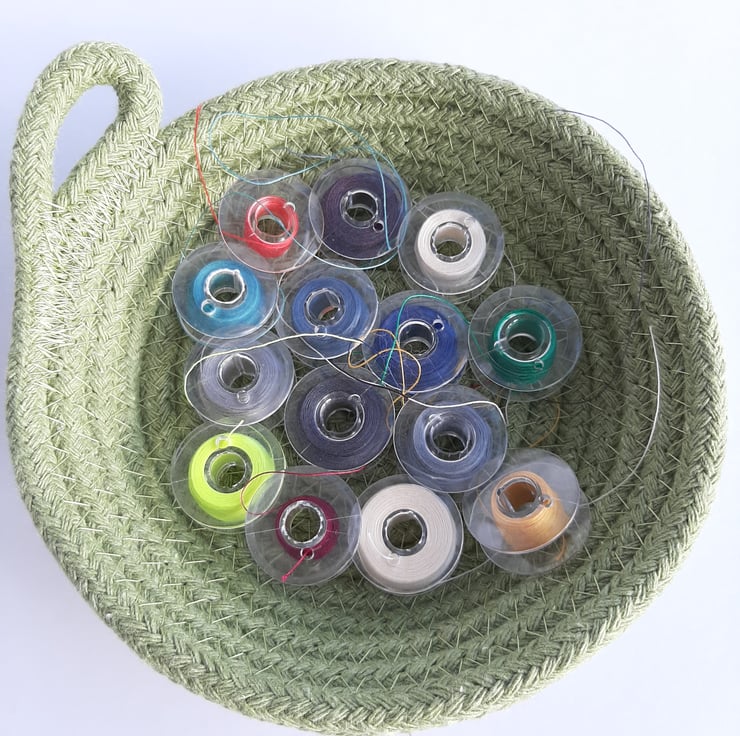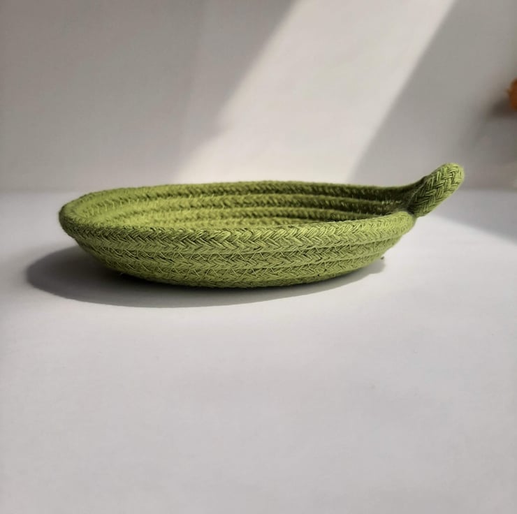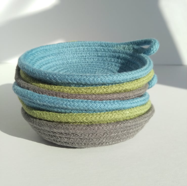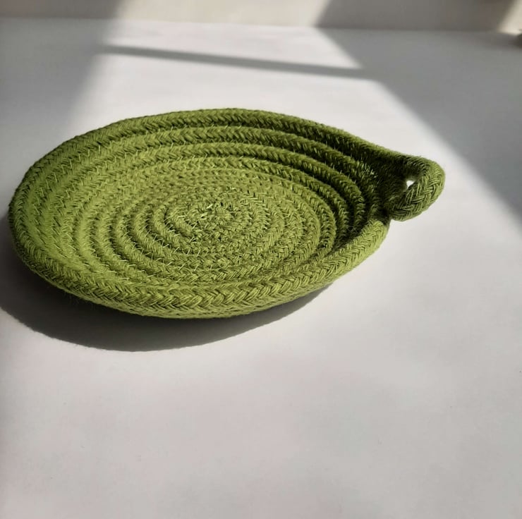 I have designed these little dishes to be a home for life's essentials. Each dish is handmade on my sewing machine from 100% cotton rope. These dishes are around 1" high and 5 - 5 1/2" high. I use a recipe for all of my designs but lots of factors; from the angle I hold the dish at as I form it to slight variations in diameter or softness of rope; can change slightly meaning each dish is unique.