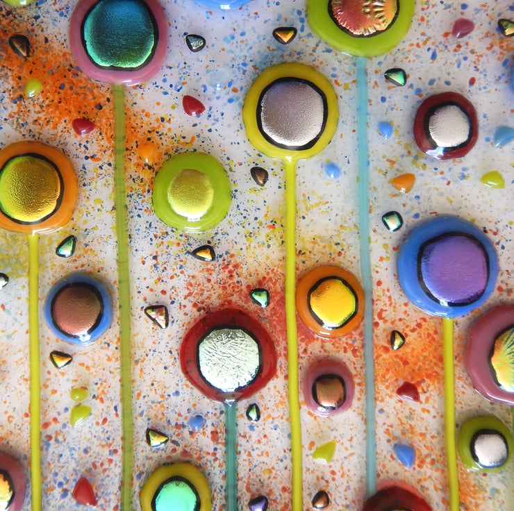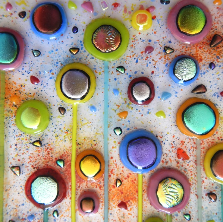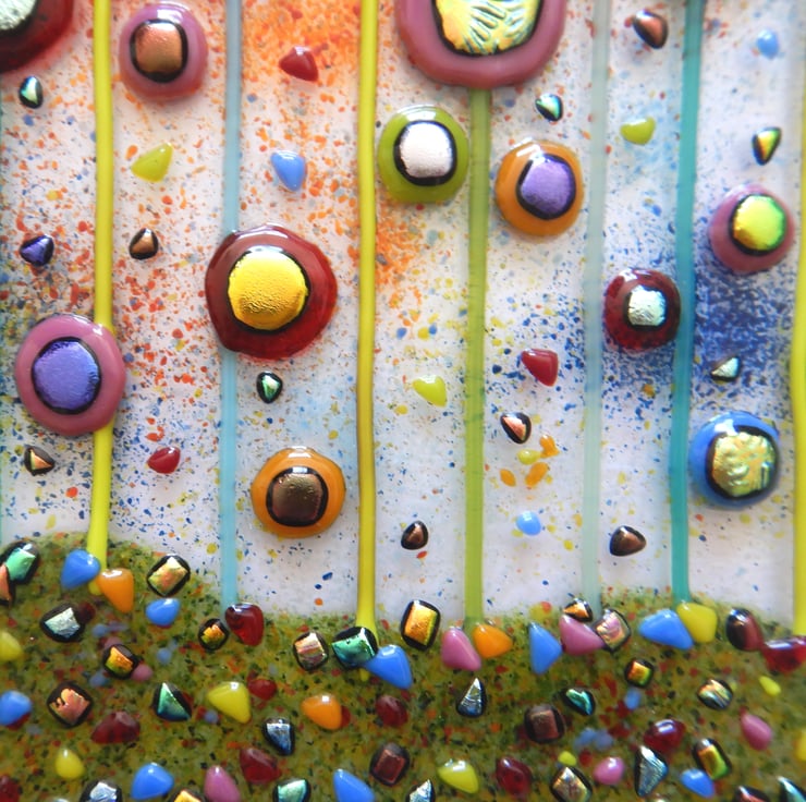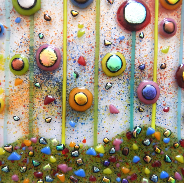 This picture has been made with extreme enthusiasm. It is almost a frenzy of colour and organised chaos. I endeavoured to squeeze in as many flowers as I could without making it too busy. I have used a variety of different glass types and techniques: glass sheet, glass stringers, frit, dichroic glass, millefiori beads, and enamelling.