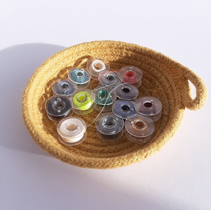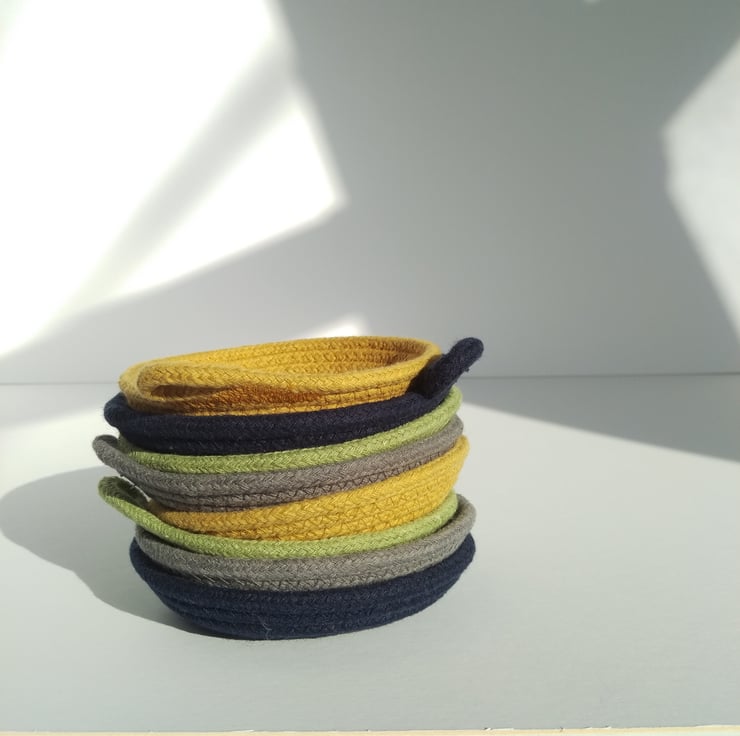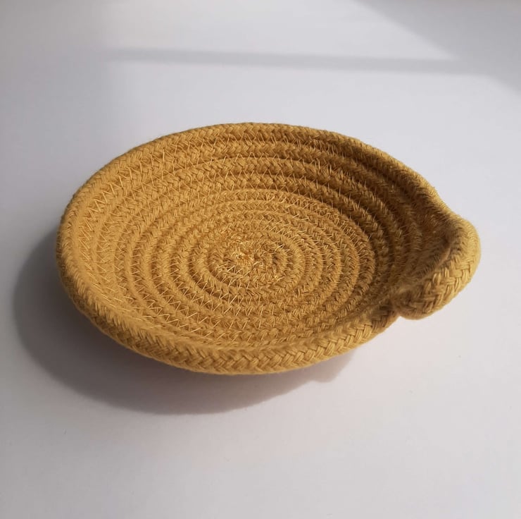 I have designed these little dishes to be a home for life's essentials. Each dish is handmade on my sewing machine from 100% cotton rope. These dishes are around 1" high and 5 - 5 1/2" high. I use a recipe for all of my designs but lots of factors; from the angle I hold the dish at as I form it to slight variations in diameter or softness of rope; can change slightly meaning each dish is unique.