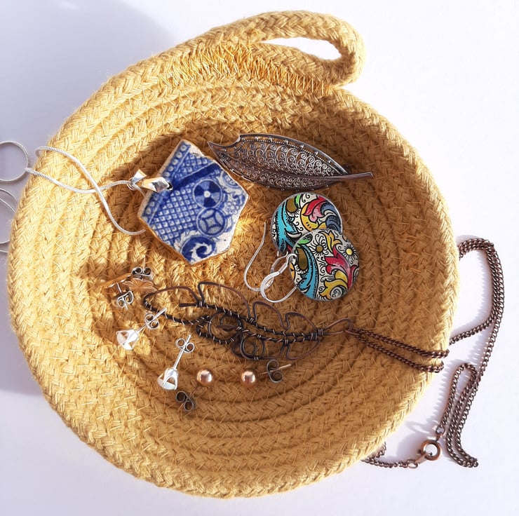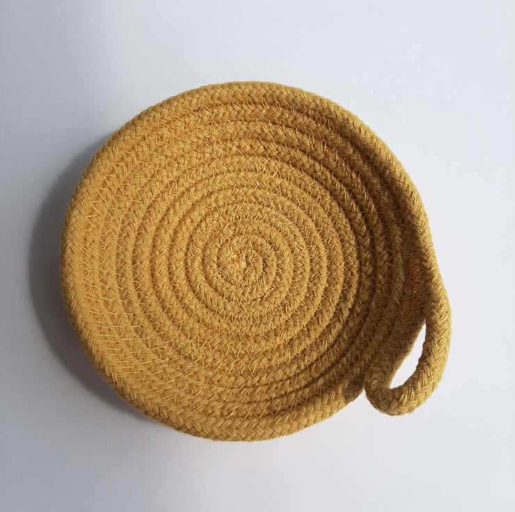 A little home for your favourite things. Handmade from 100% cotton rope in a mustard colour.