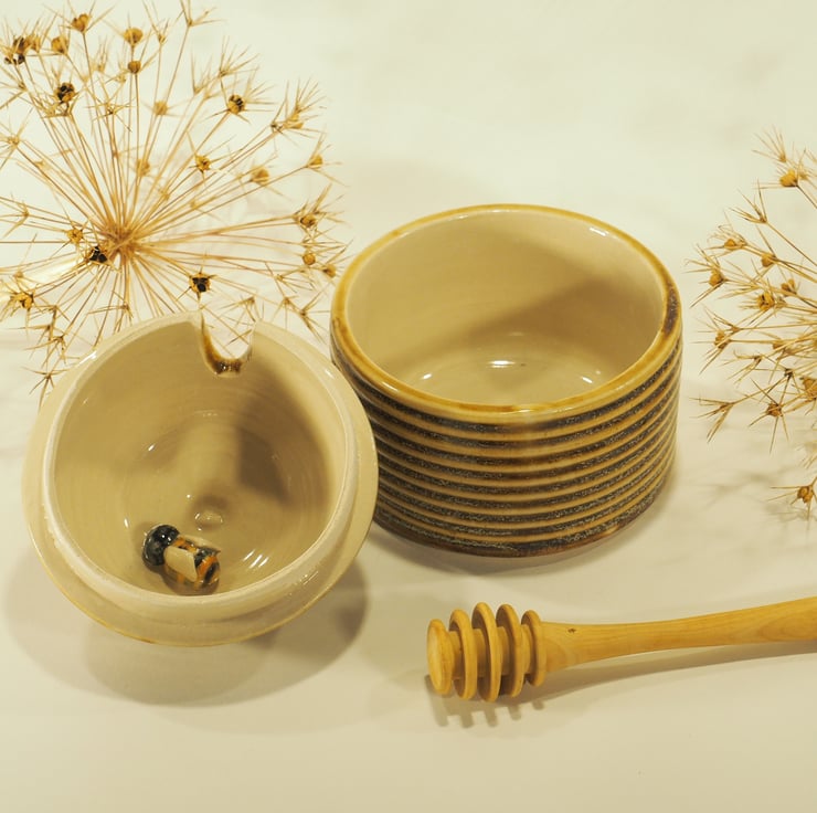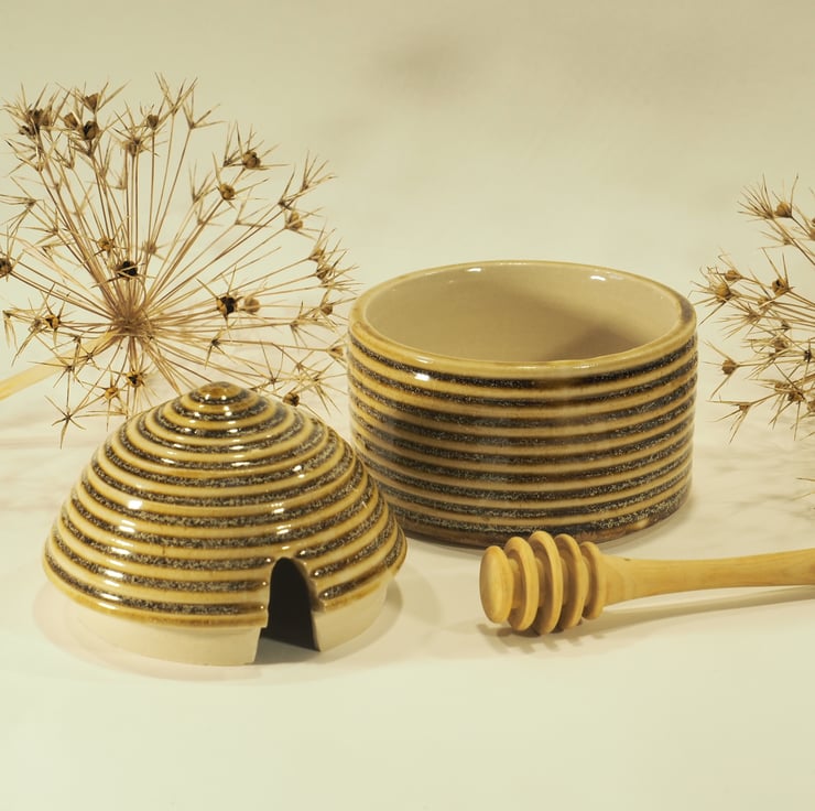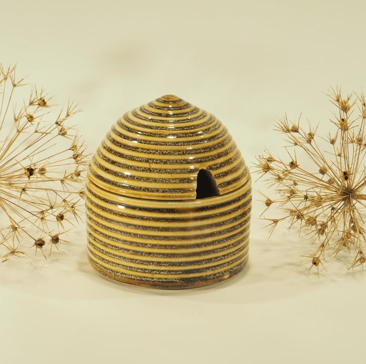 A handmade honey pot shaped like a traditional beehive or skep. Where the bees go in and out there is hole which means you can leave the spoon in the pot. Lift the lid and you'll find a little bee inside.