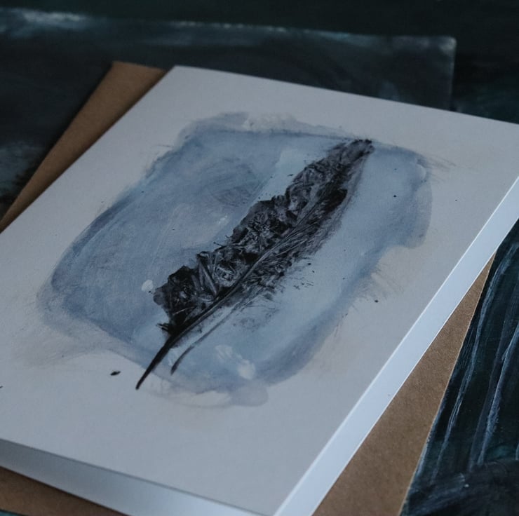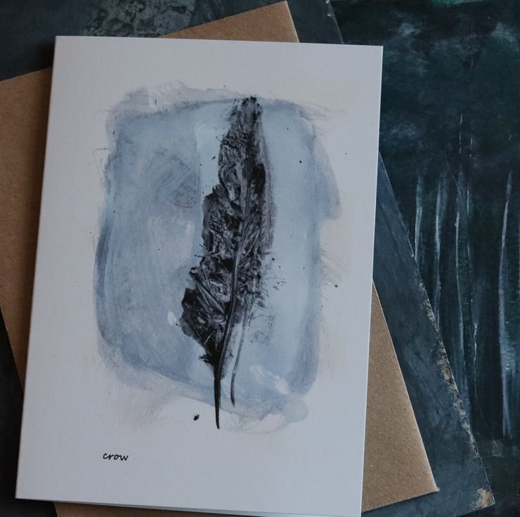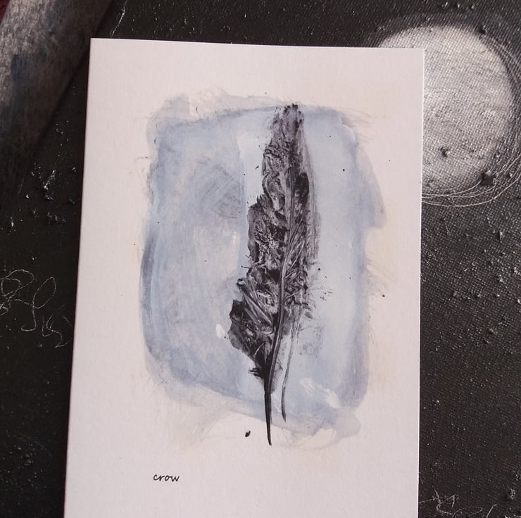 a printed greetings card from an inky session with a sketchbook and crow treasure.