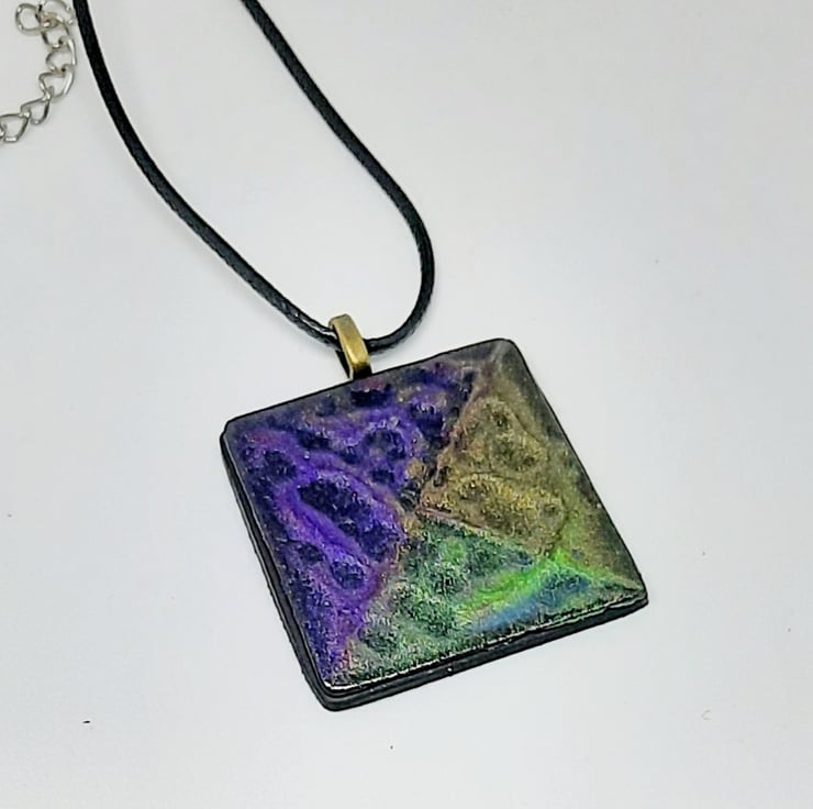 Abstract pendant necklace featuring an eye catching fluid art design.