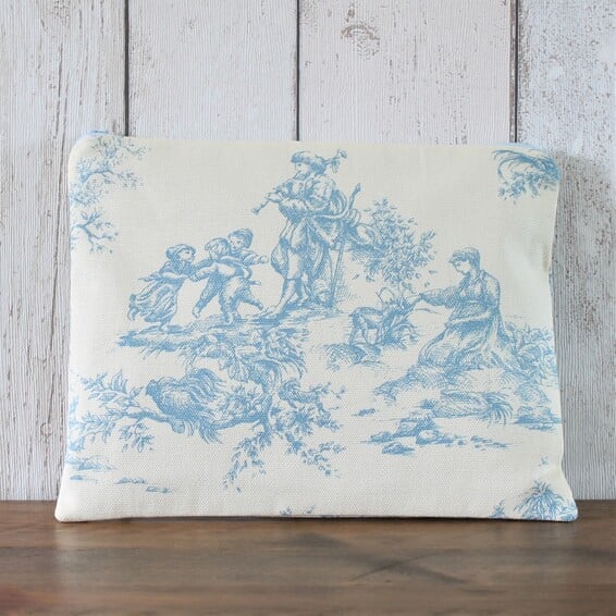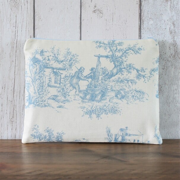 A zipped makeup bag in a cotton fabric with a blue Toile de Jouy print on a cream coloured background. Lined with a blue cotton fabric, the makeup bag measures 23.5cm wide x 18cm wide.
