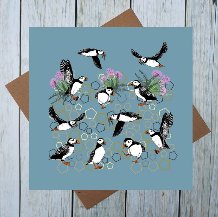 A Circus of Puffins greetings card can be ordered individually or a pack of 2, 3 or 4. The greetings cards is brightly coloured and eye catching with hand drawn Scottish puffins.