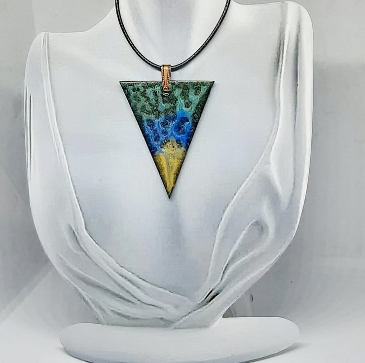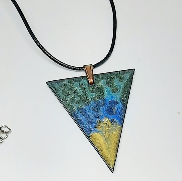 Escape to the beach with this abstract pendant necklace featuring an eye catching fluid art design.