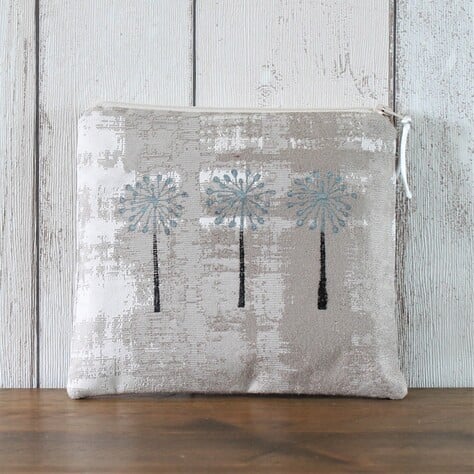 A zipped makeup bag in a distressed look beige fabric with an iridescent blue and black hand block printed seed head design. Lined with a checked blue cotton fabric, the makeup bag measures 17cm wide x 15cm wide.