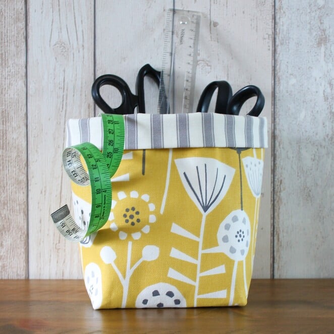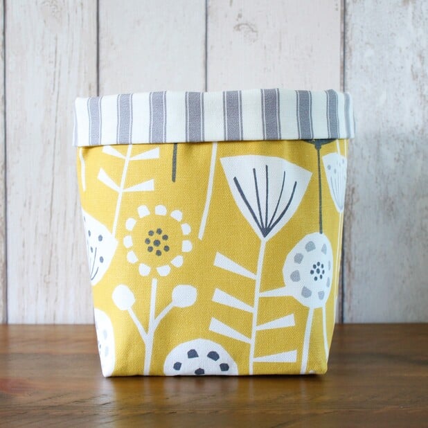 Scandi floral print cotton fabric storage bin in bright sunny yellow, grey and cream . The storage bin has a coordinating grey striped ticking fabric lining.