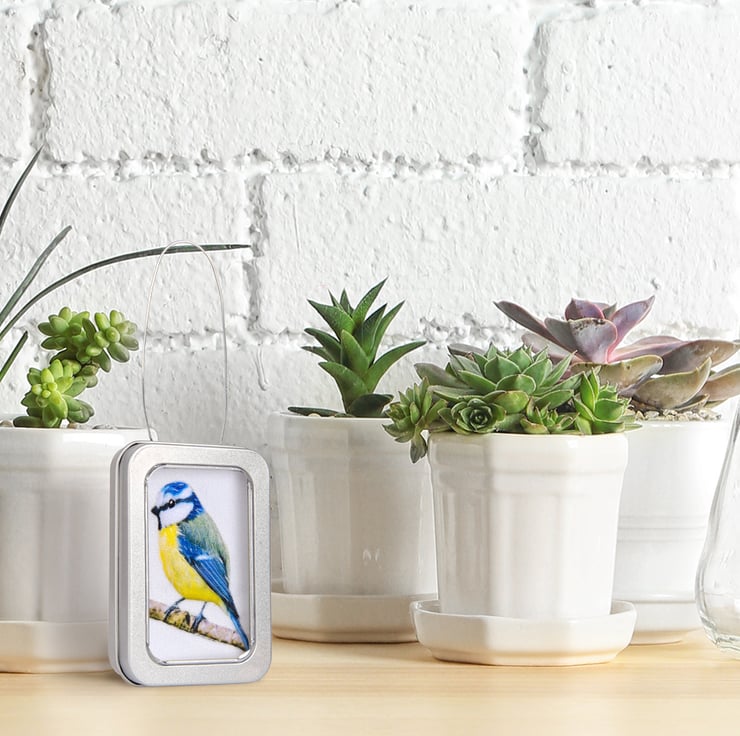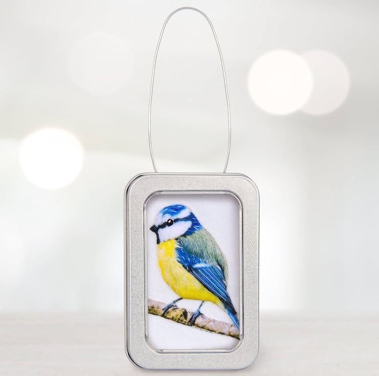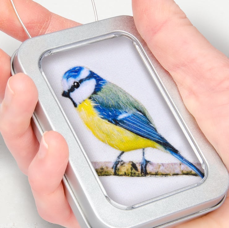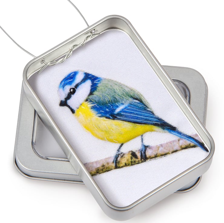 This is a little 3D fabric Bluetit, framed in a sturdy recyclable aluminium tin, with a wire hanger.