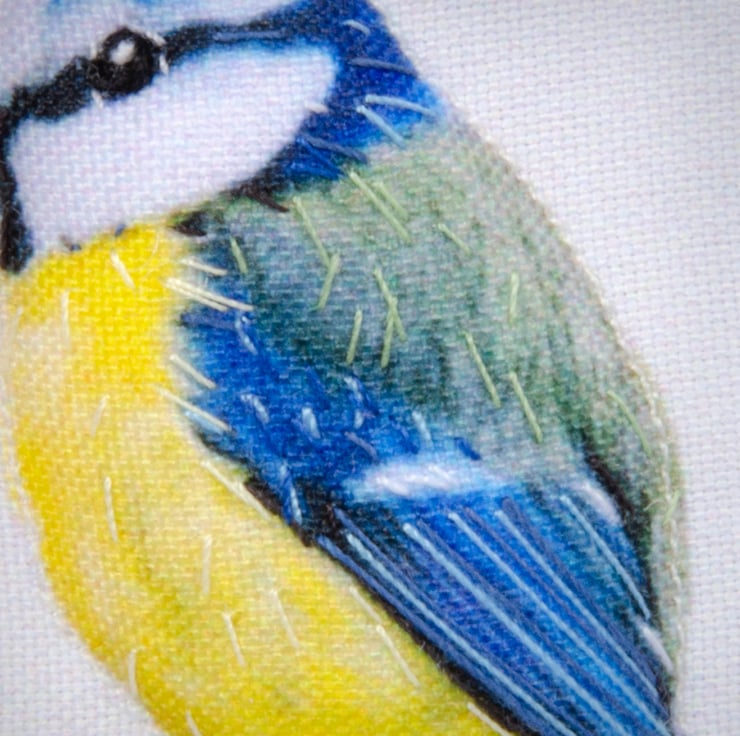 An embellished fabric print, carefully machine stitched and slightly padded, to give an unusual three-dimensional appearance. I have added the details with hand-embroidery.