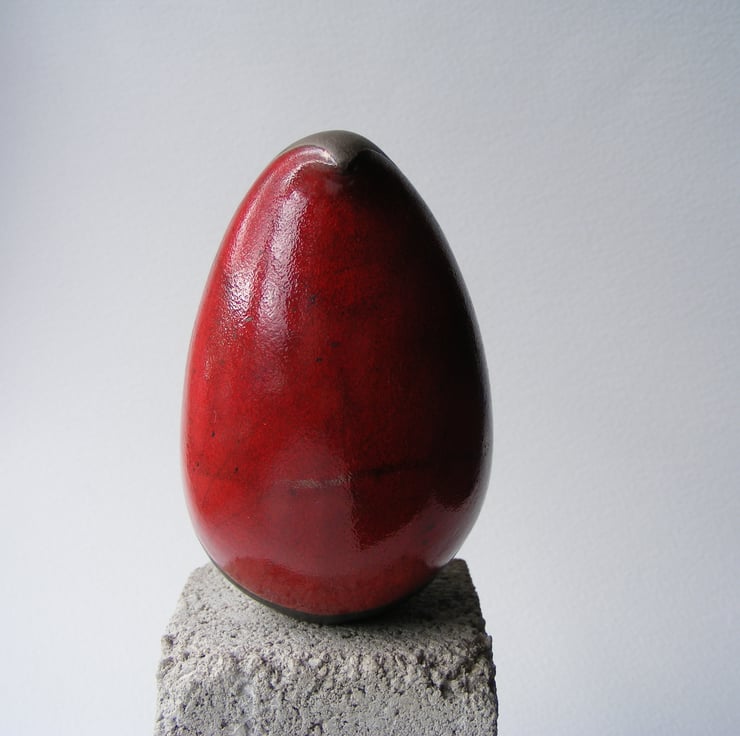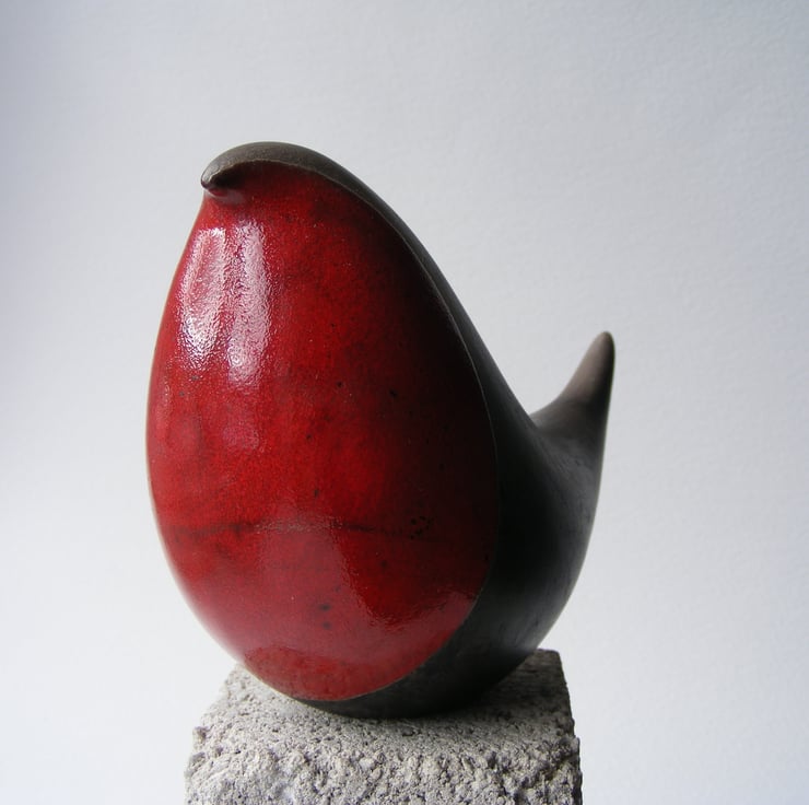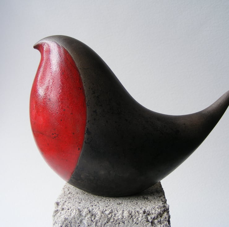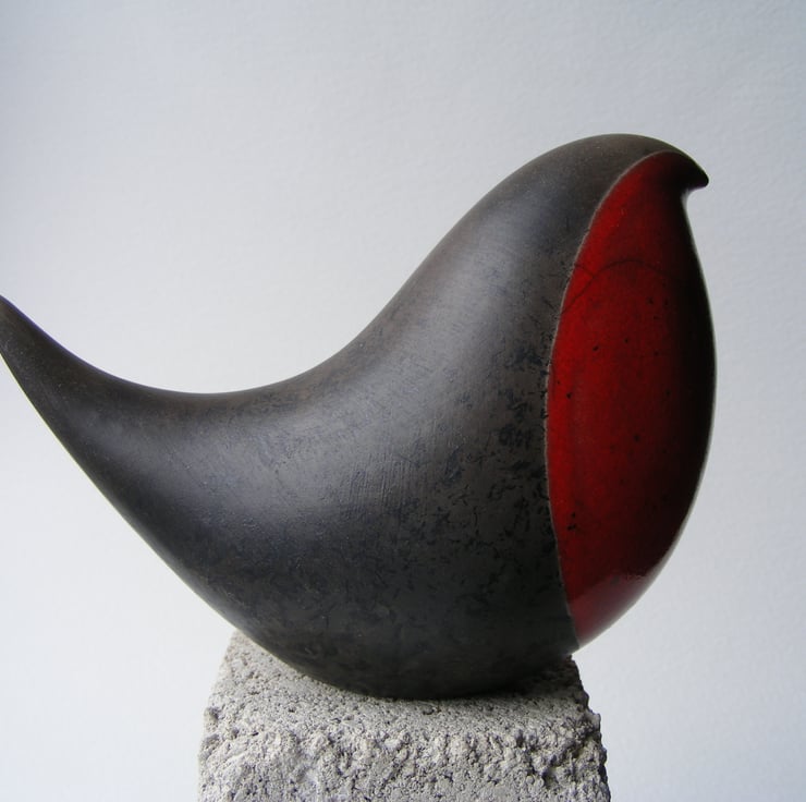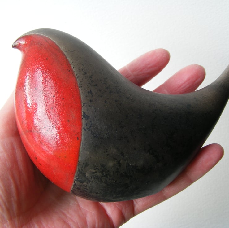 This robin is hand made and measures approx, 9cm high and 12cm long. It is made from white earthenware clay and fired first in an electric kiln then the red glaze is painted on the breast and it is raku fired in a gas kiln, the dark part of the bird is unglazed so comes out a black/greyish colour after being smoked in sawdust, sometimes it has sawdust shadows smoked on to the surface. It is then washed, lightly sanded and polished with beeswax.