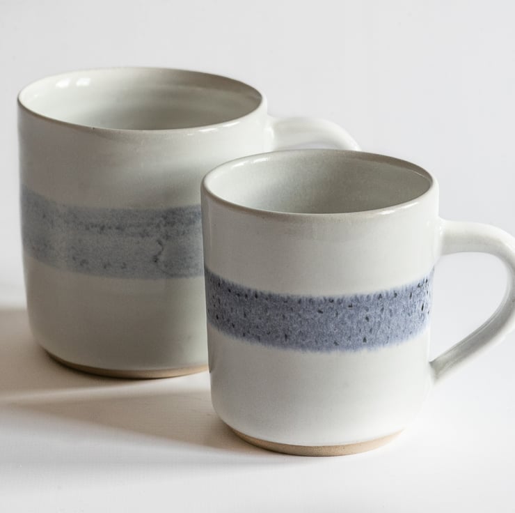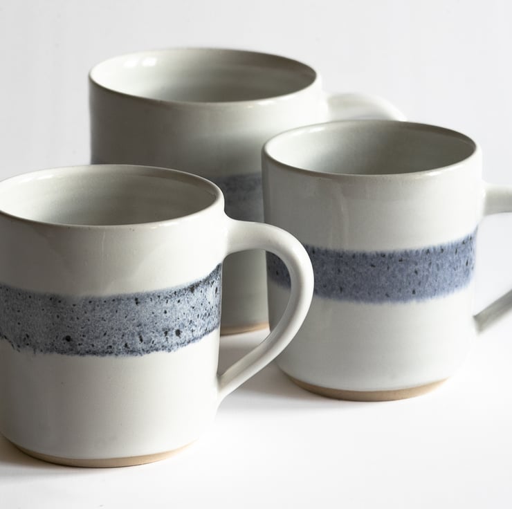 These mugs are all thrown on the potters wheel. Once I have thrown a large batch they are left to dry until they become "leather hard". I then trim them to tidy the base and refine the body shape. At this stage I add the handles and also a band of blue slip around the middle of the mug (this is a liquid clay with stains or oxides added which creates the colour). The mugs now have their first firing to change them from clay to ceramic. After this initial firing they are dipped in a shiny white glaze. They are now fired again to a temperature of 1270 degrees c. This vitrifies the glaze, making the mugs water tight, strong and durable.