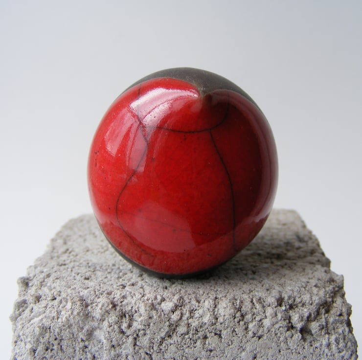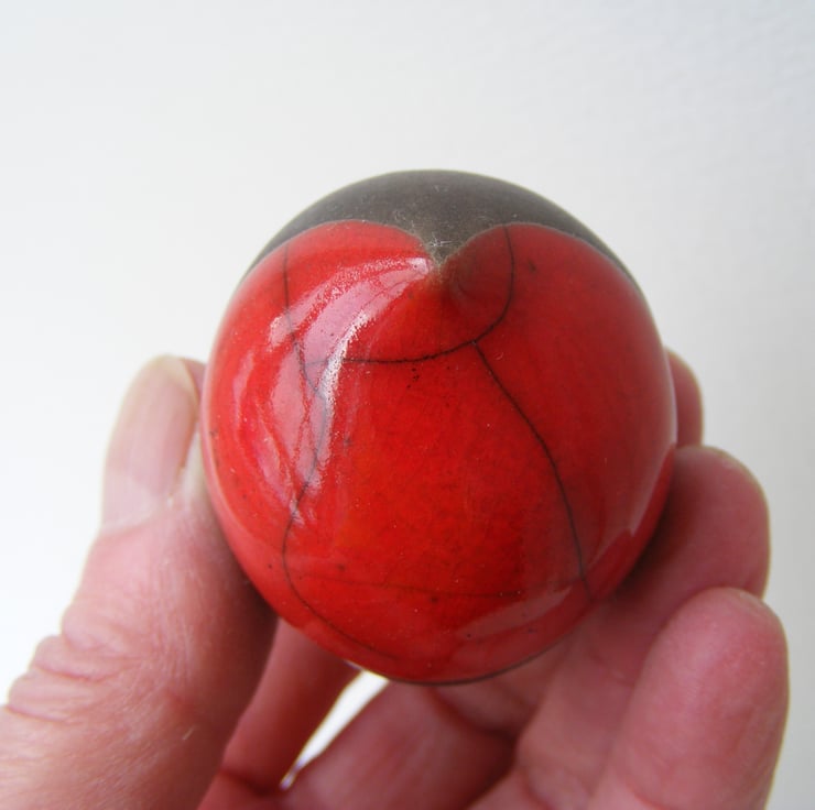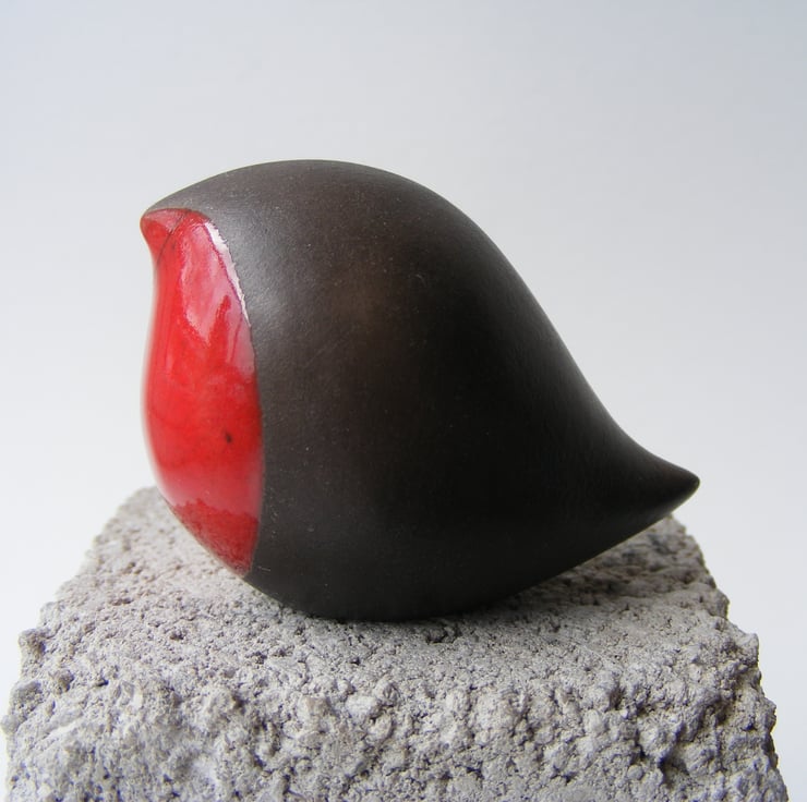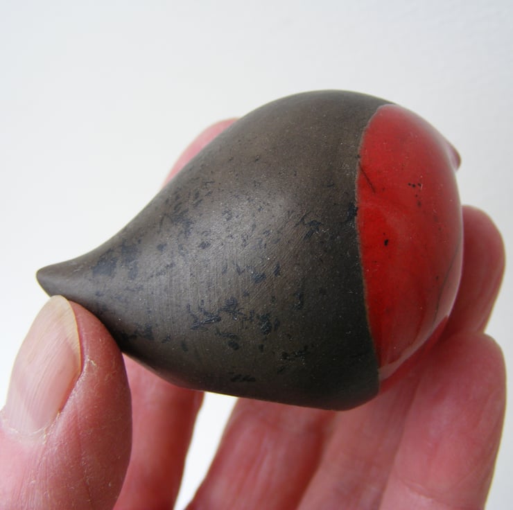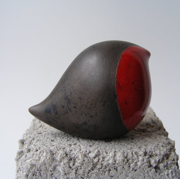 This little robin is hand made and measures approx, 3.8cm high and 5.4cm long. It is made from white earthenware clay and fired first in an electric kiln then the red glaze is painted on the breast and it is raku fired in a gas kiln, the dark part of the bird is unglazed so comes out a black/greyish colour after being smoked in sawdust, sometimes it has sawdust shadows smoked on to the surface. It is then washed, lightly sanded and polished with beeswax.