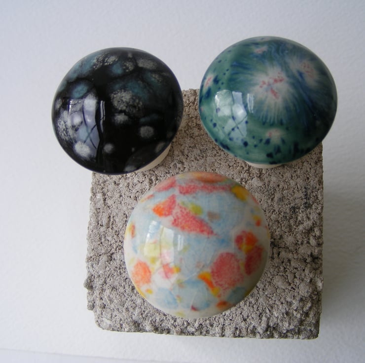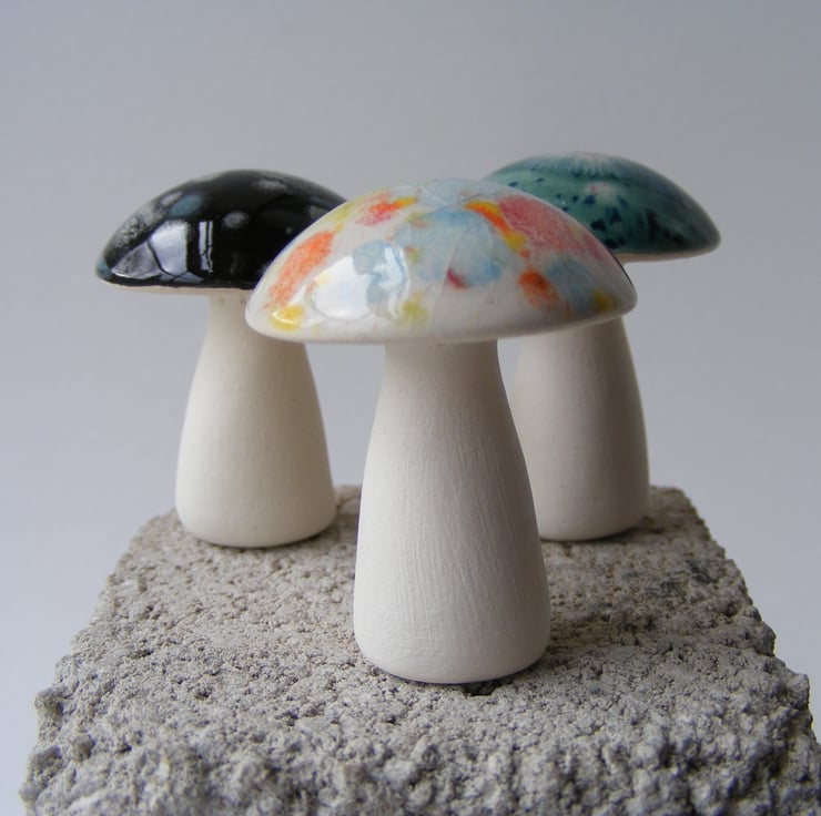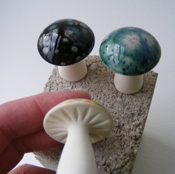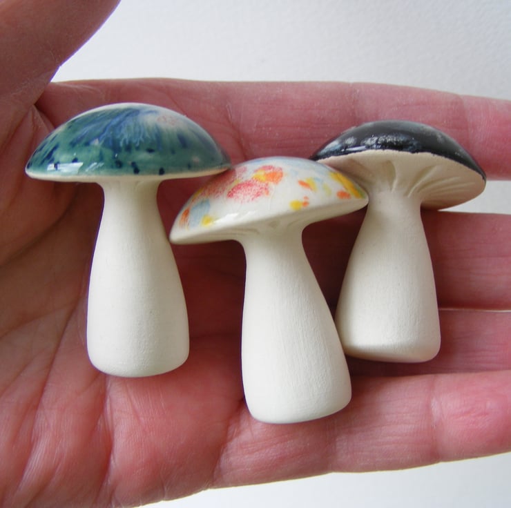 These mini mushrooms measure approx 3cm wide and 4cm high. They are hand made from white earthenware clay and modelled from one piece of clay. After firing, the caps have a crystalline glaze painted on and are fired again, the stem is unglazed. This listing is for a set of three mushrooms.