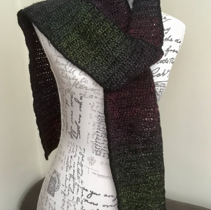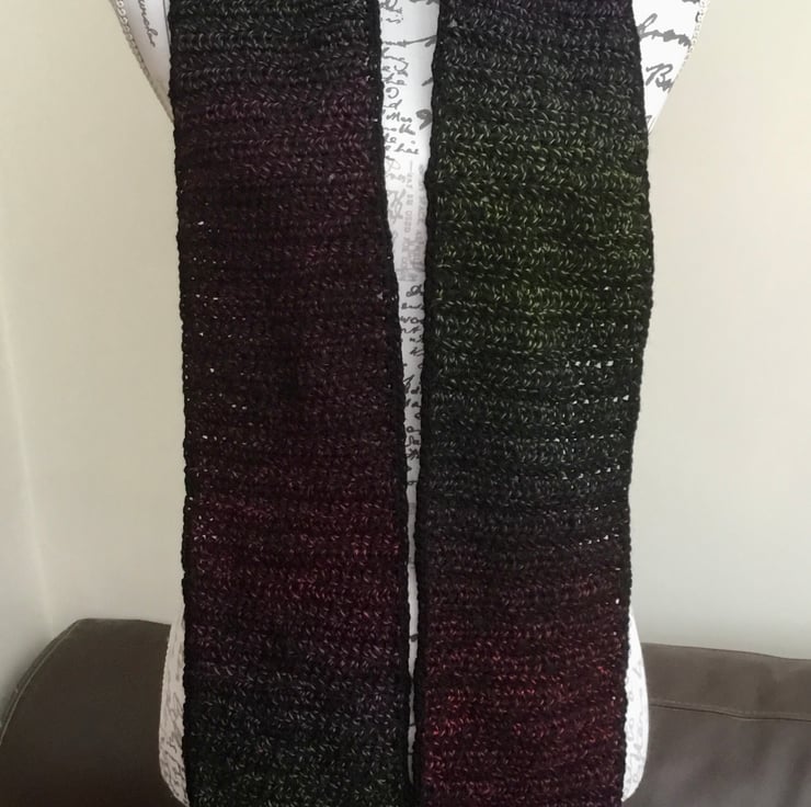 Totally hand crocheted by myself to my own unique design, on medium hook to give a soft tighter stitch, there are no seams or joins in the scarf, except to join in the black edge frame.