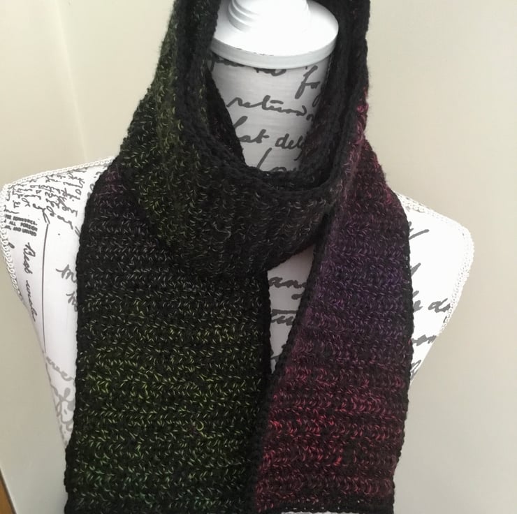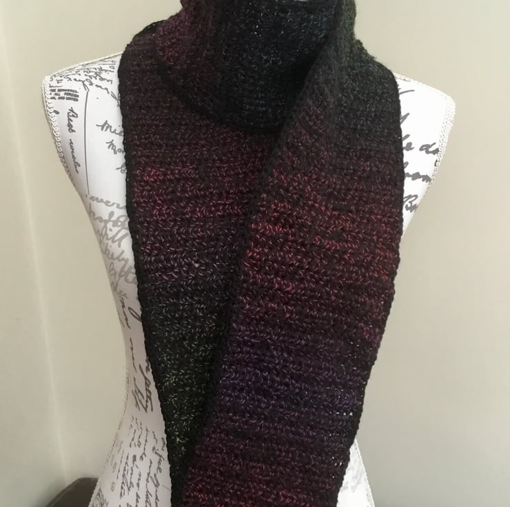 This scarf is crocheted in horizontal rows in the transitional yarn, then edge crocheted in plain black yarn. It can be worn over the head and ruffled around the neckline as a neck muff, or wrapped loosely, however you prefer.