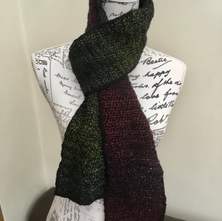A Classic and sophisticated slim line Midnight Rainbow designer yarn long Scarf, perfect for keeping warm and stylish! Crocheted in Denys Brunton designer yarn that has a black base and a rainbow colours transitional thread, and edge crocheted in plain black.