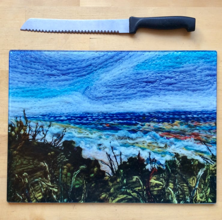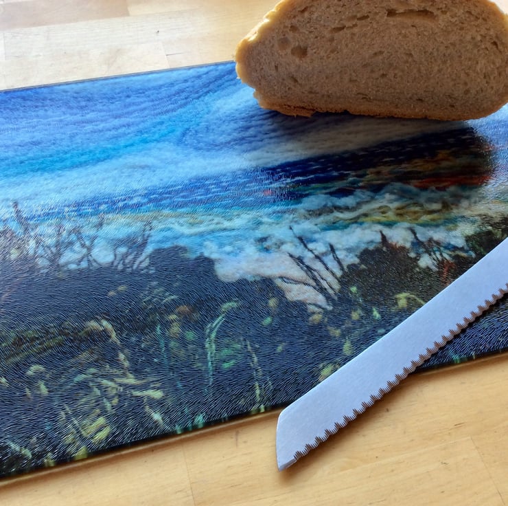 This unique glass chopping board has a textile seascape which you can see through the grassy bank. The glass board is heat resistant, makes a perfect cheeseboard, work top saver and a stunning center piece for the table. Easily cleaned. Size A3 landscape.