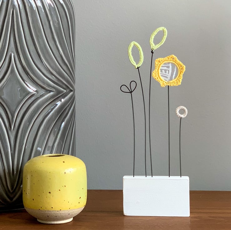 Wire flower stems with cotton crocheted flower heads add cheer to any space.