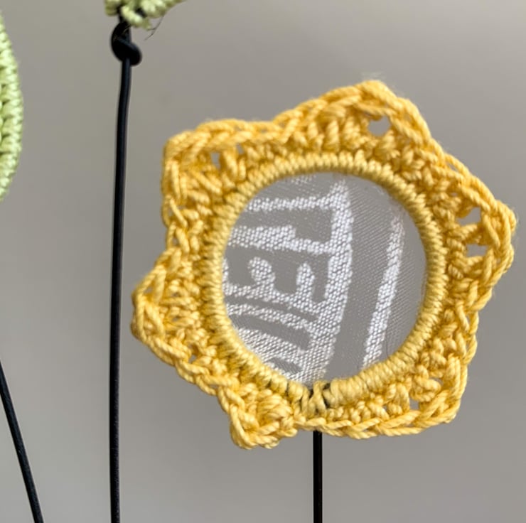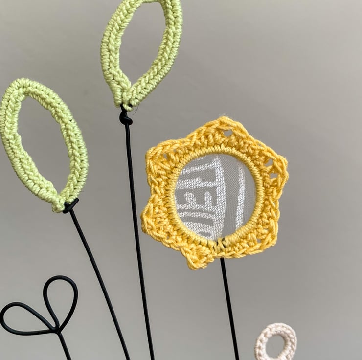 A pretty voile in the centre offsets the sunshine yellow of the crocheted flower with tall pale green leaves by it's side. The arrangement arrives assembled, in a box that will fit through your letterbox.