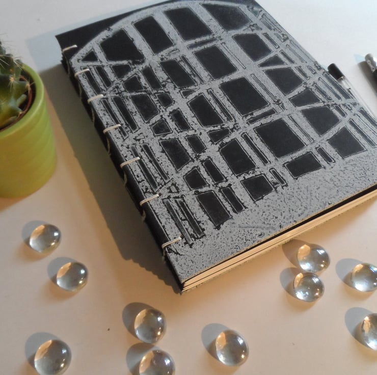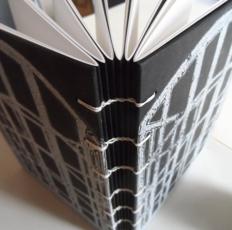 This is a handstitched book which I have bound using Coptic stitch and white waxed linen thread. This style of binding (Coptic) allows the pages to open completely flat.