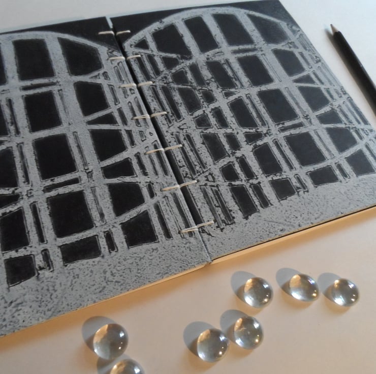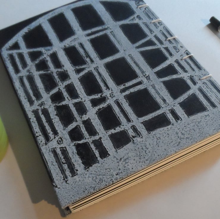 The outside covers front and back are original monoprints, acrylic on paper, and based on an image of the gas tower in Reading, UK. The insides of the cover are plain black paper.