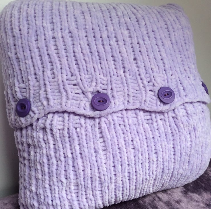Cushion cover, knitted in soft chenille wool acrylic mix wool blend. The cushion cover is an envelope style with Purple buttons on the one side and has been knitted in a rib pattern.