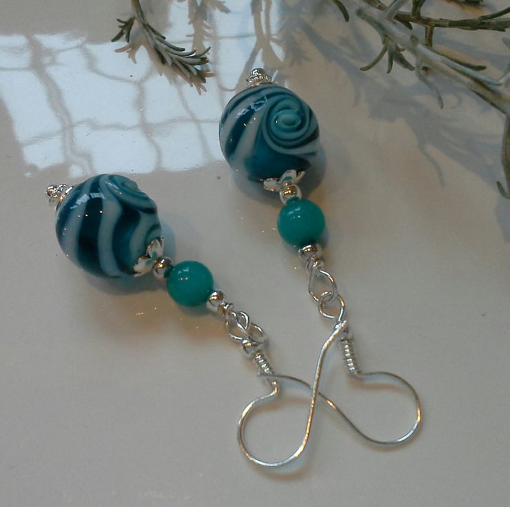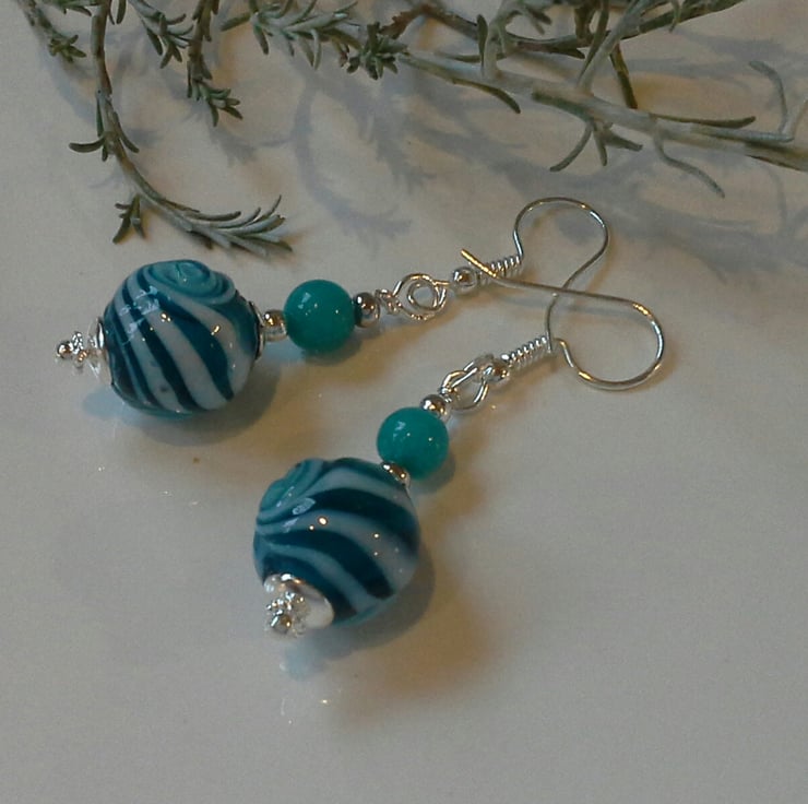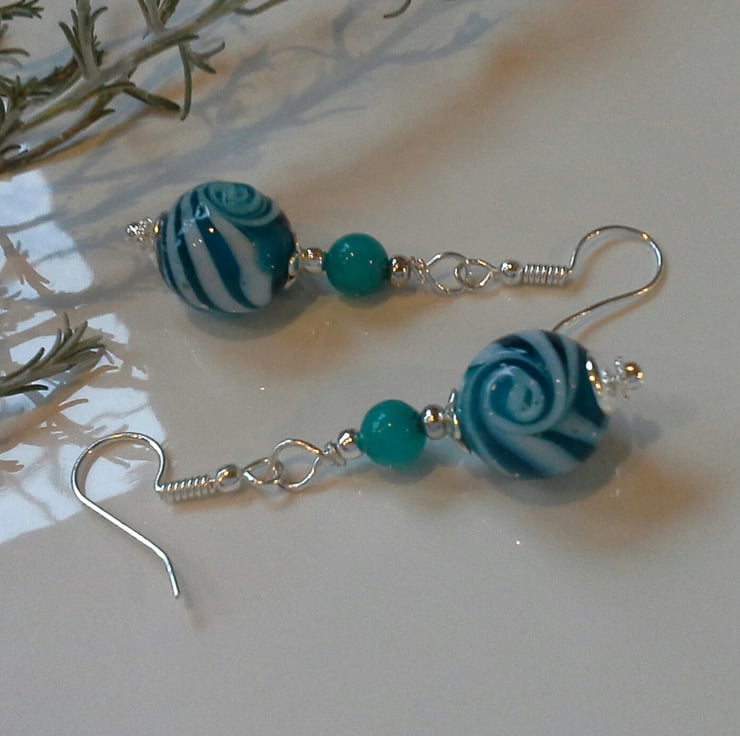 A unique pair of earrings designed and hand crafted using genuine hand blown 14mm vanitian glass beads and 6mm quartzite round gemstones. They have been crafted using all quality silver plated components. The vanitian glass beads are slightly different in appearance due to the nature of being hand blown. The beads where purchased in Venice by my friend years ago as a gift for me to make into jewellery.