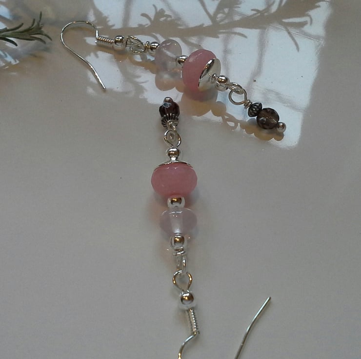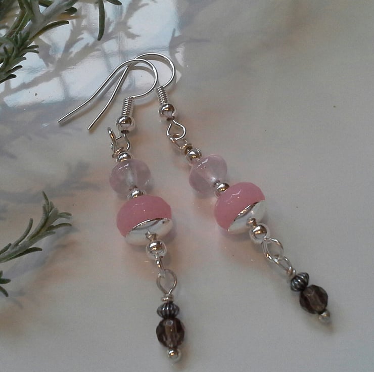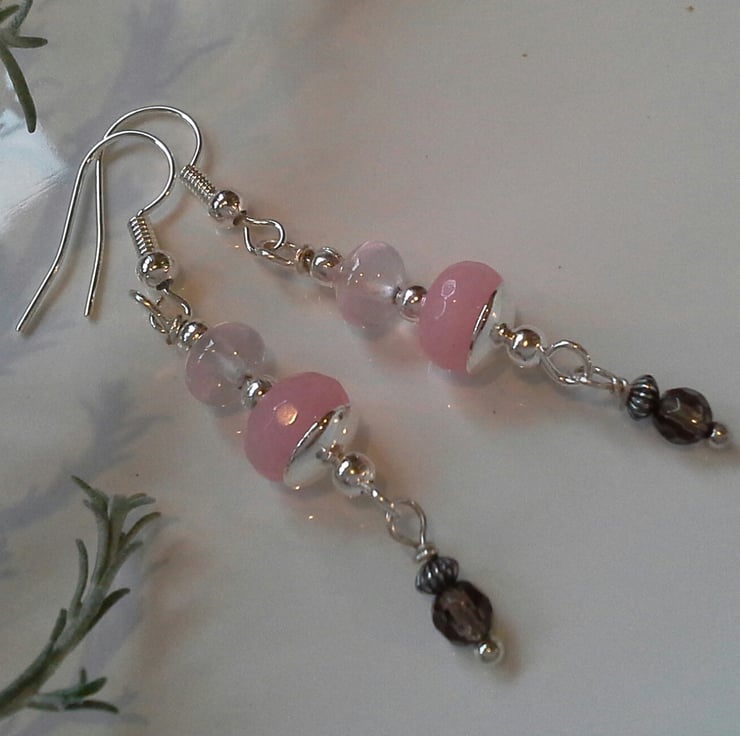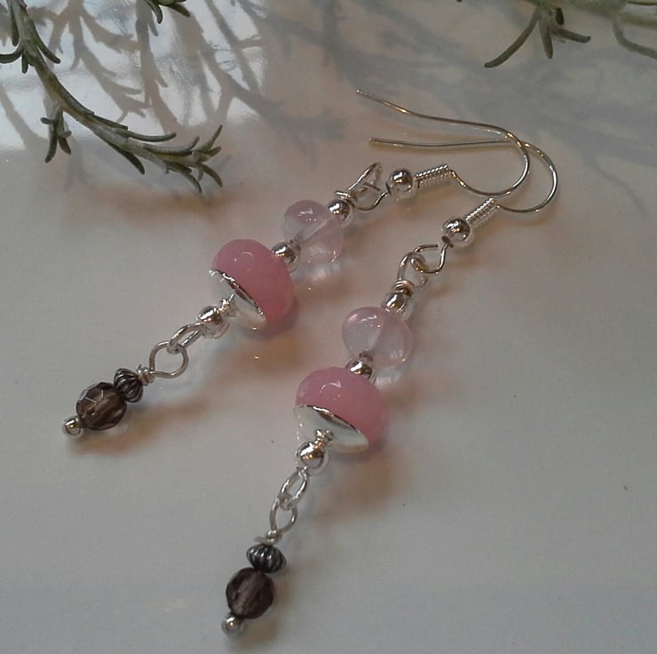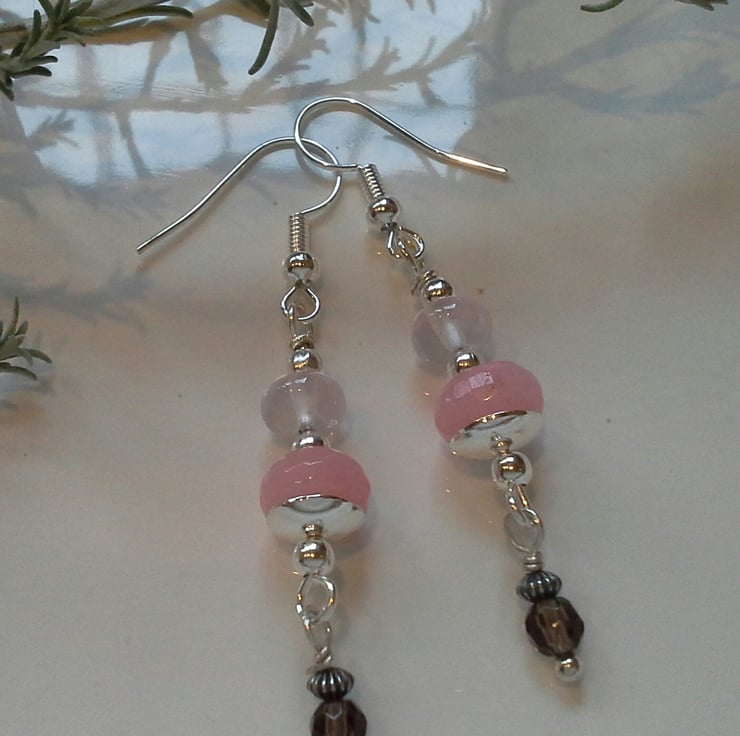 A very attractive pair of earrings lovingly designed and hand crafted using faceted 10mm rondelle cut pink jade, 6mm rondelle rose quartz and tiny 3mm faceted smokey quartz gemstone beads. The dangling smokey quartz have been made from 925 oxidized sterling silver beads and 925 sterling silver head pins. For the remaining metal earring components quality silver plated findings have been used.