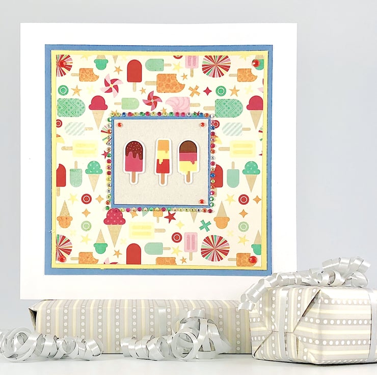 This large card measures just under 8 inches square. It is made using a selection of gorgeous patterned and plain papers with rainbow faux jewels and chunky lolly embellishments. Lovely colourful card for someone who loves the sunshine and those seaside candy treats!