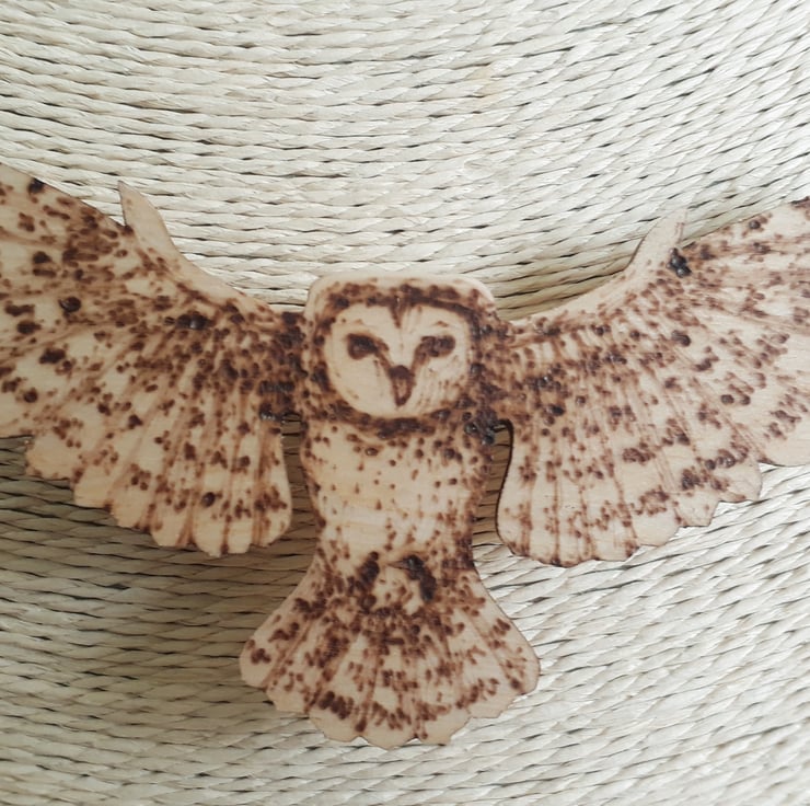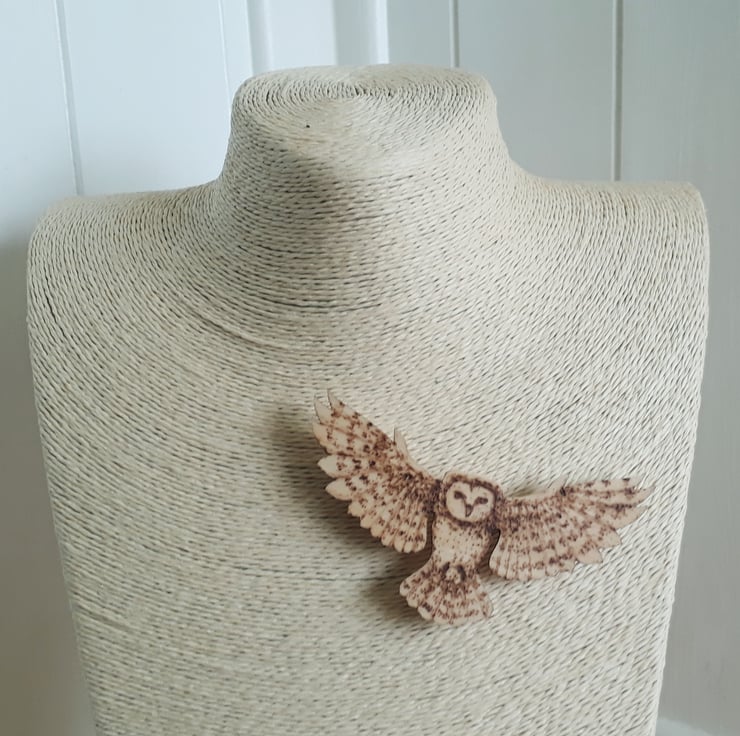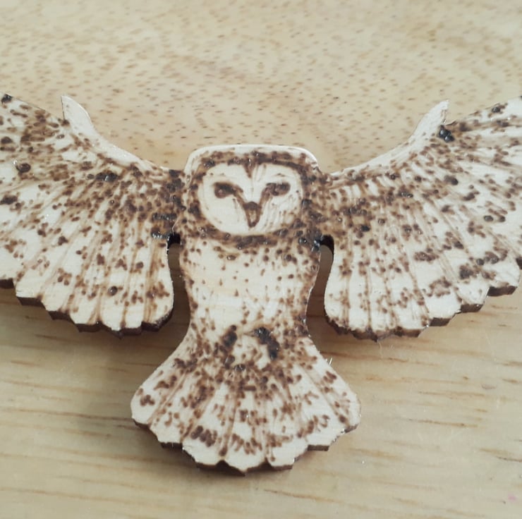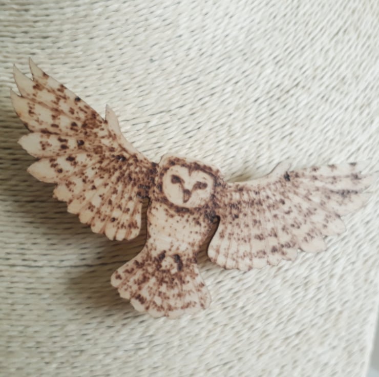 Wooden brooch of a barn owl decorated using pyrography (wood burning).