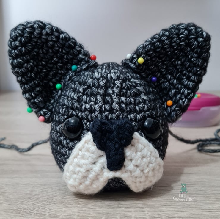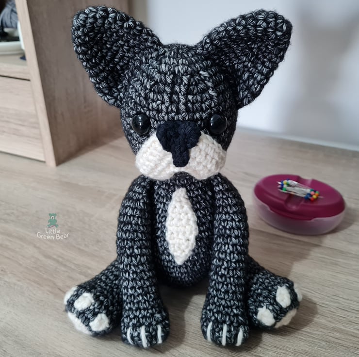 Franklin, the clever little French Bulldog, loves to sing and practices most of the day - making some very interesting noises… he is very loyal to his human and loves to spend his evenings lap-warming (whilst snoring over the telly). He sits 9 inches tall (when made with the recommended materials).