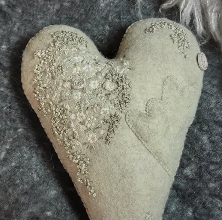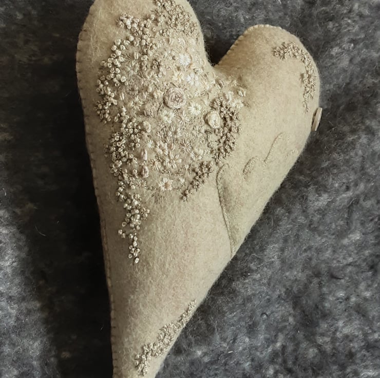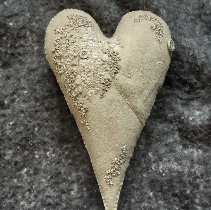 I have used various threads of different weights and thicknesses to give texture. The embroidered flowers and blossom have been sewn using various green threads similar in colour to the heart background, lots of sage, moss and pale greens, also deeper greens that the camera hasn't picked up and a few natural threads for contrast.