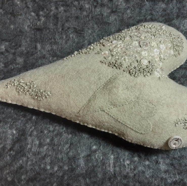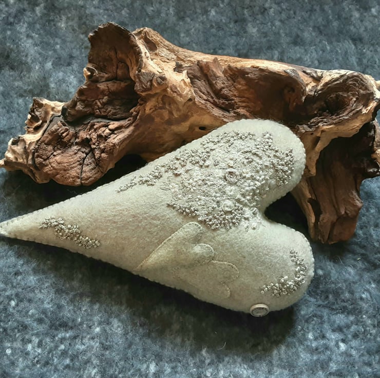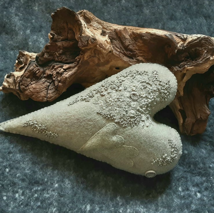 This is a one off, unique design created by Bearlescent. A Beautiful hand embroidered hanging heart which was hand sewn from wool felt in Lichen, a mossy/algae green with grey veins running through.