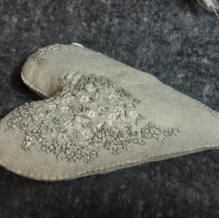This is a one off, unique design created by Bearlescent. A Beautiful hand embroidered hanging heart which was hand sewn from wool felt in Lichen, a mossy/algae green with grey veins running through.