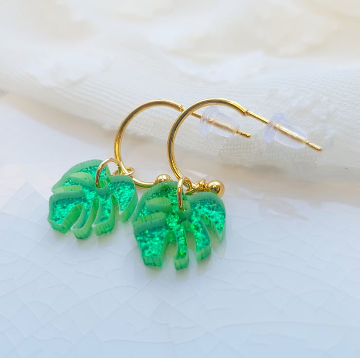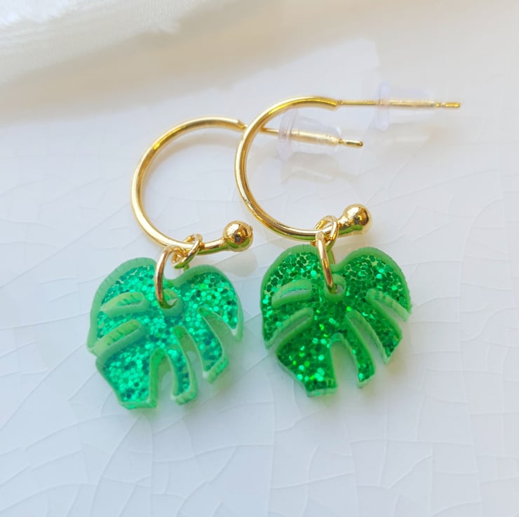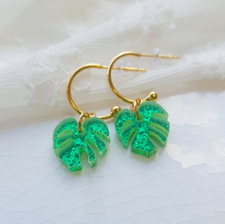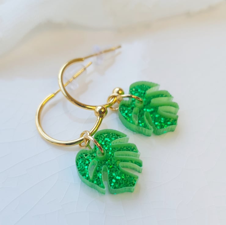 Sparkly green glitter encrusted resin leaf charms hang from beautiful gold half hoops.