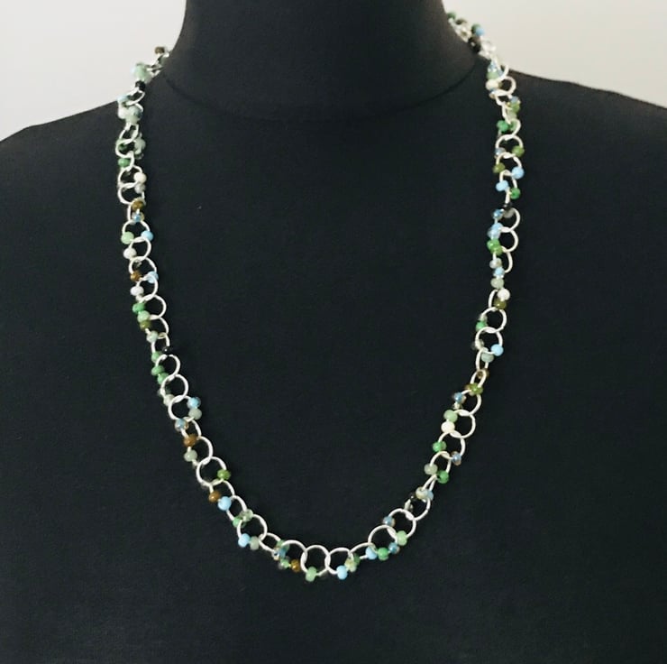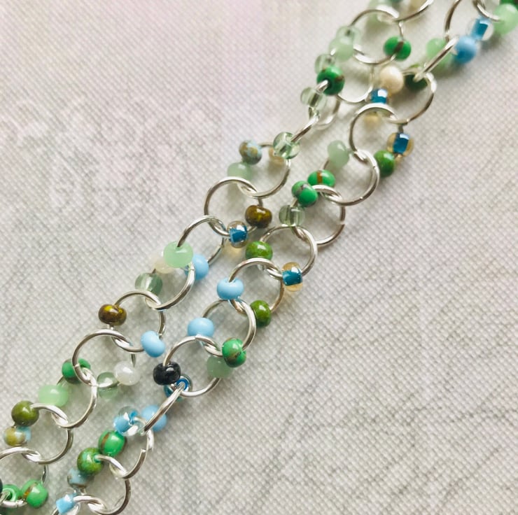 Bead & link necklace. Handmade chain with blue, green & brown hued chunky seed beads. Necklace measures approx 54.5cms & fastens with a magnetic clasp.