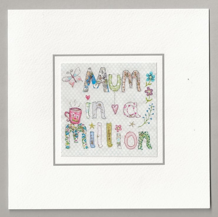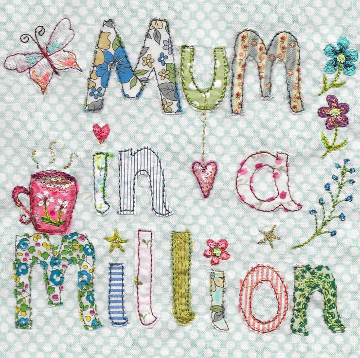 A pretty mum in a million, handmade Mother's Day card, designed and created by the artist Suzanne Hooson using layered fabrics and free machine embroidery, printed and hand finished with glitter for an extra sparkle. This card is perfect for a special mum on Mother's Day or any day.