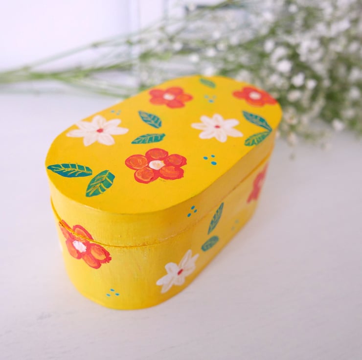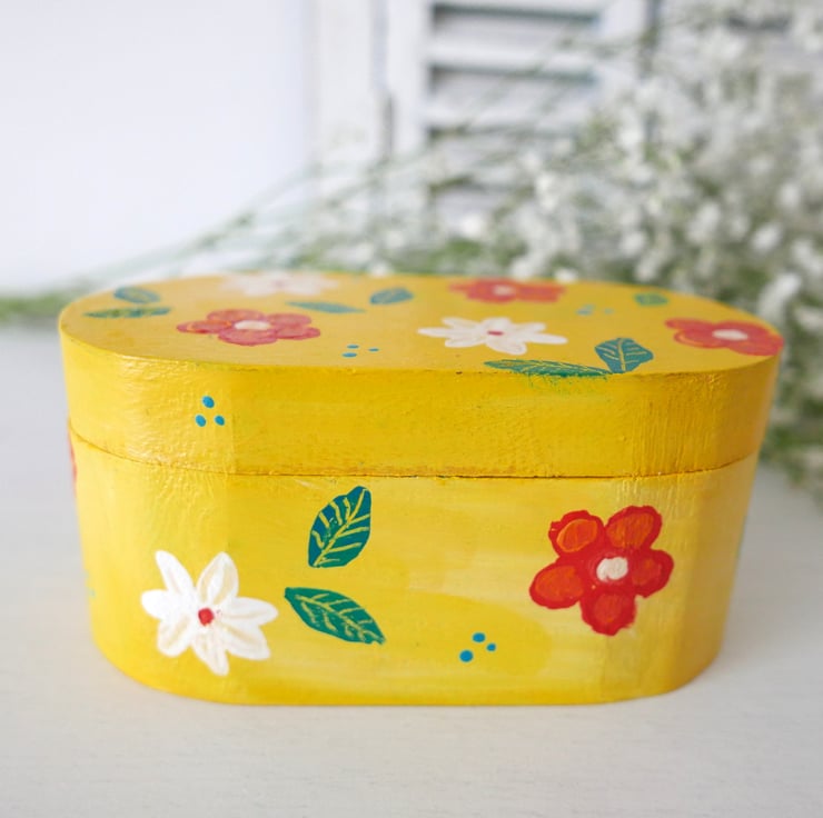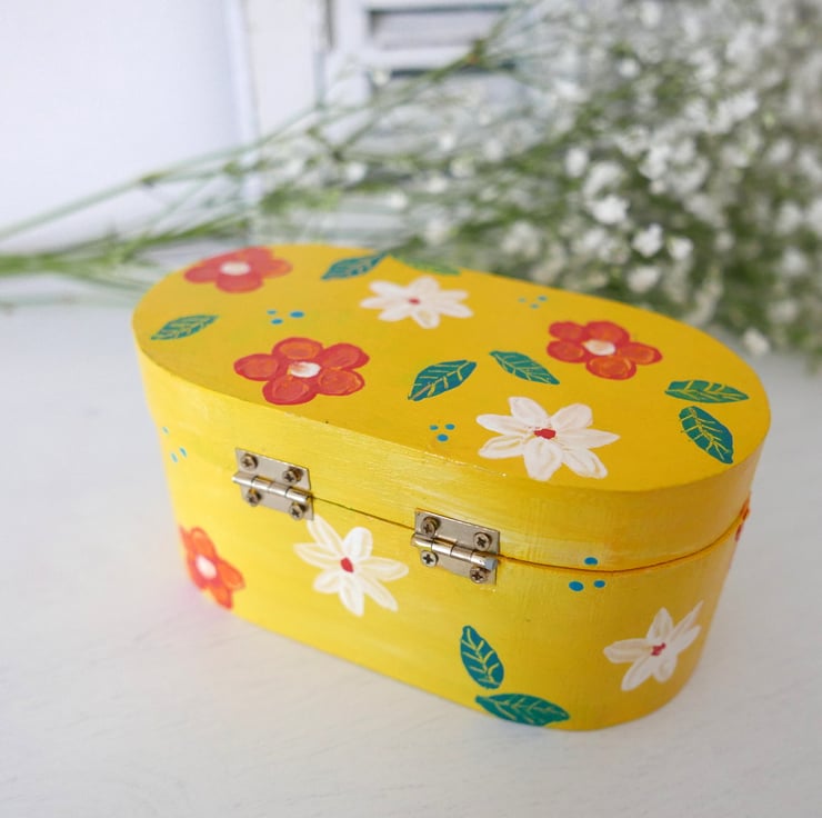 This bright yellow floral box is perfect as a trinket/jewellery box for girls. It is hand-painted by me with acrylics paints and it is varnished for protection. It features orange and white flowers and teal leaves. You can store small jewellery items or hair clips/ hairbands.