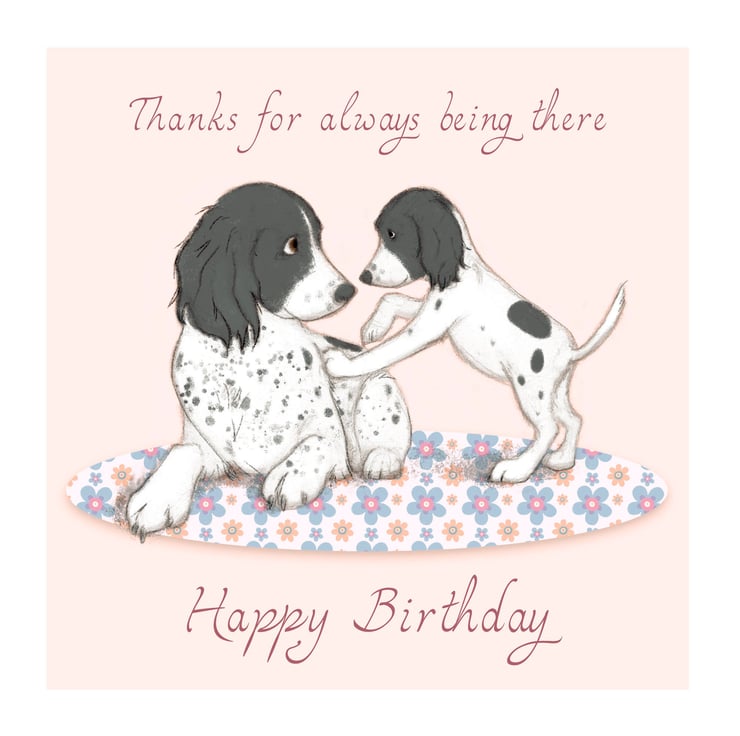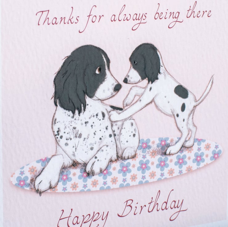 Illustrated Birthday card depicting a Springer Spaniel dog ready to respond to her little one's every need. Why not show your special someone how much they mean to you with this charming Birthday card.