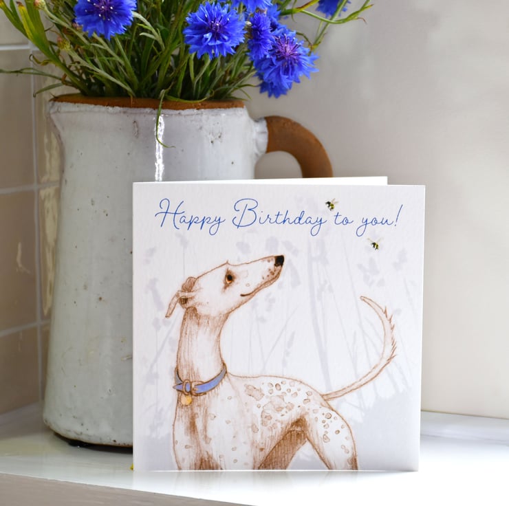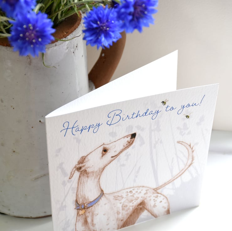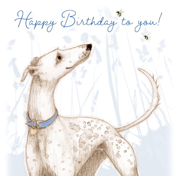 A greetings card illustration of a white dappled Greyhound dog.