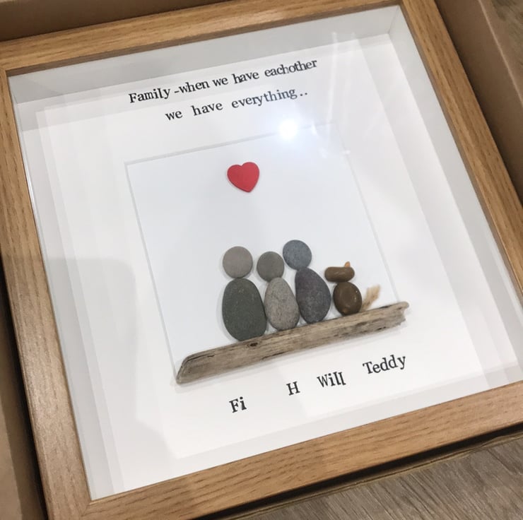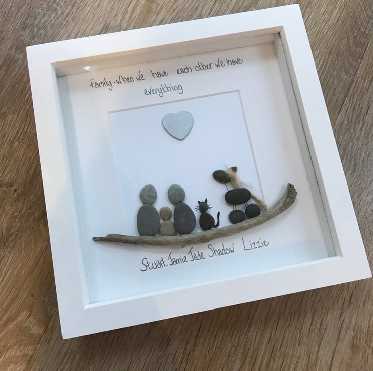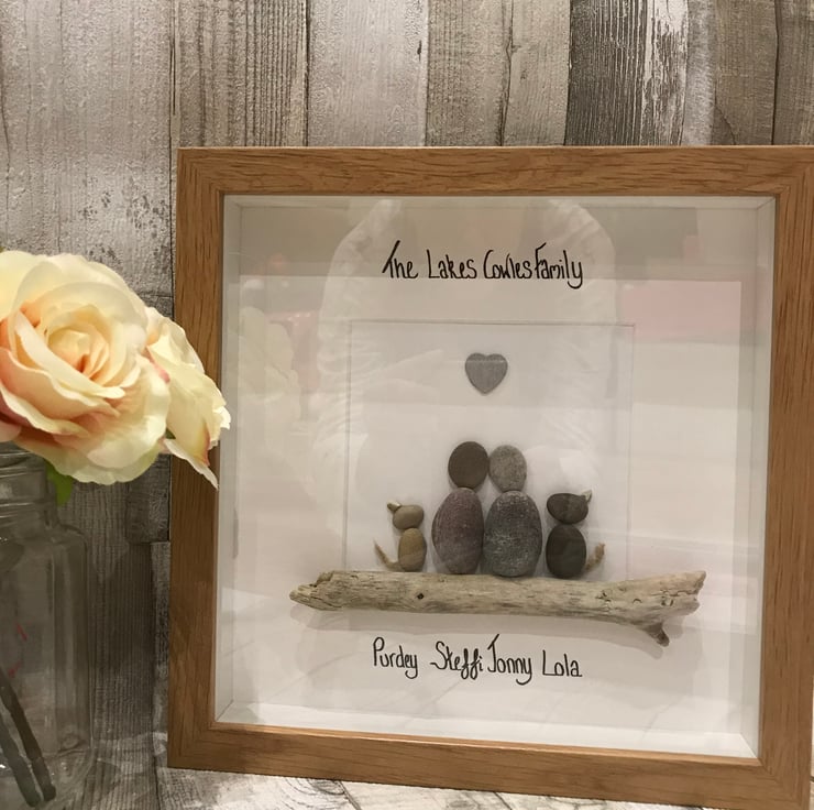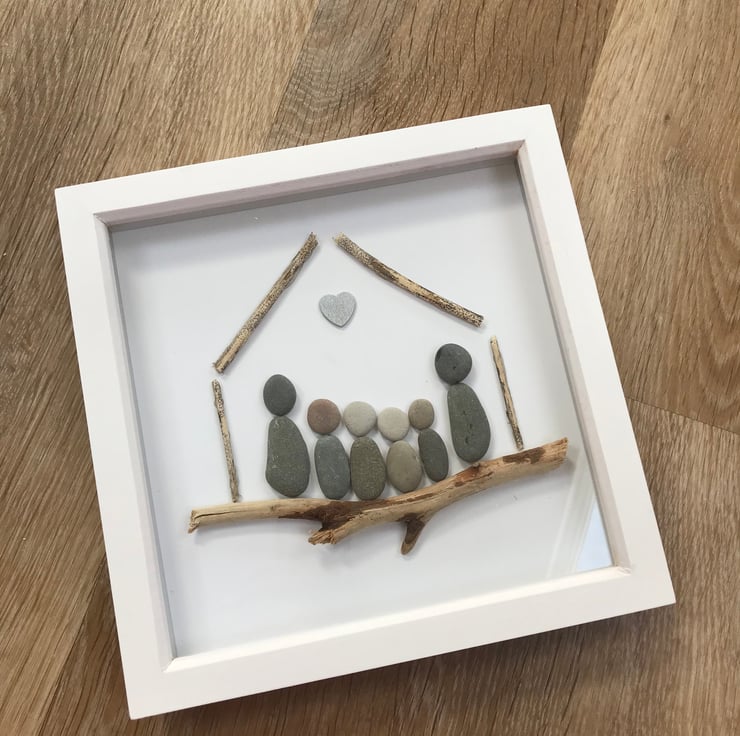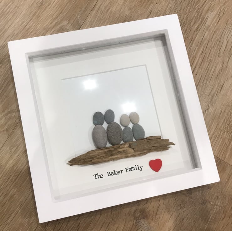 These are handmade, using hand picked pebbles and usually in a 20 x 20cm frame. There are a range of frame colours to choose from including Grey, Wood effects and black.