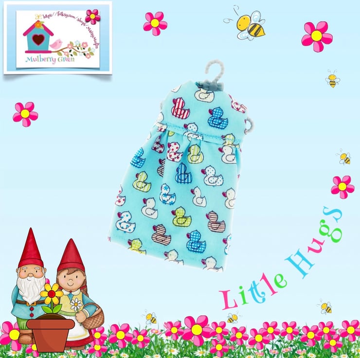 A pretty little turquoise nightie in a cute little ducks print, made especially to fit the Little Hugs dolls or baby Daisy. The nightie is made from cotton and has a lined bodice and gathered skirt. It fastens at the back with a little popper and comes on a cute little hanger.