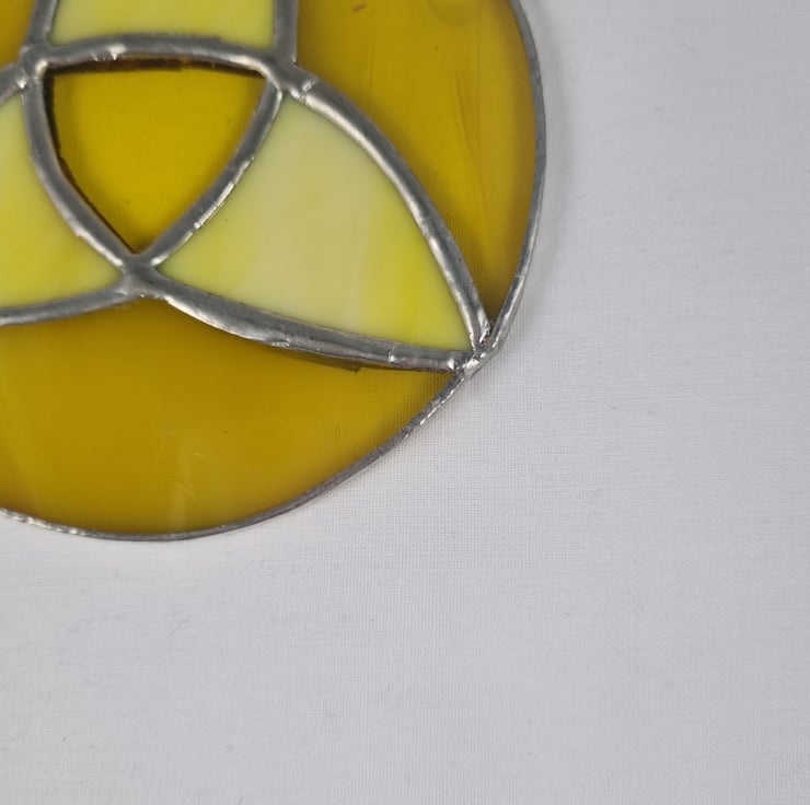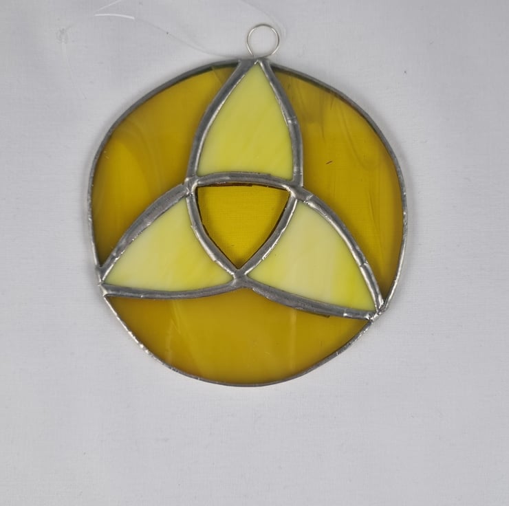 The Celtic circle is inspired by the Triquetra design and is handmade using the copper foil technique.