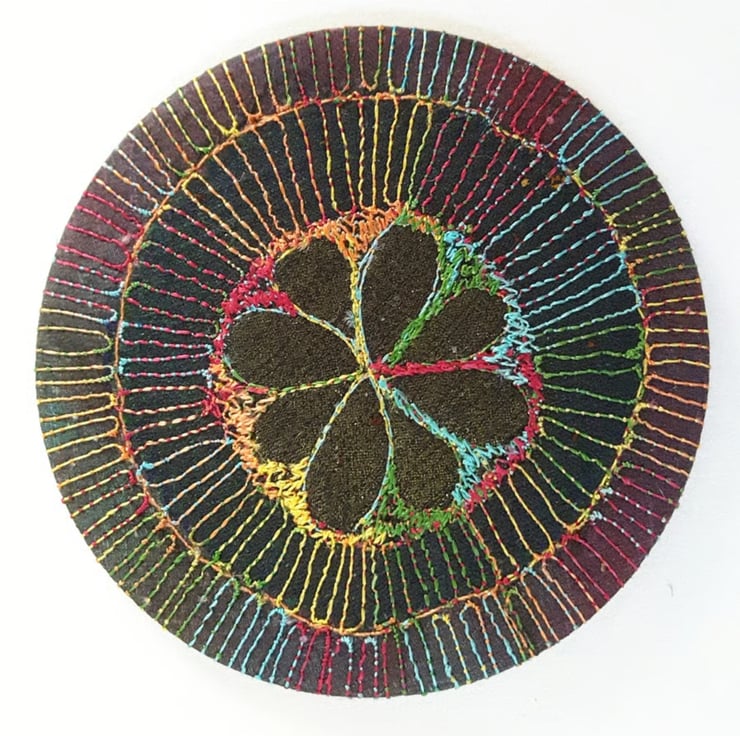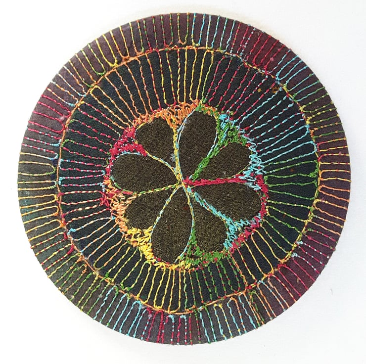 Made from layers of fabric including hand dyed Egyptian cotton and silk fabrics using the free machine embroidery style of sewing