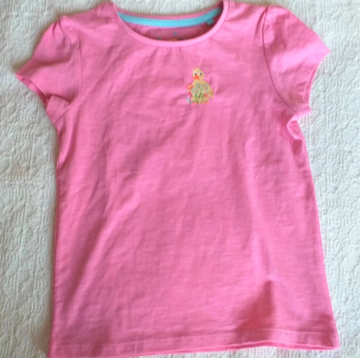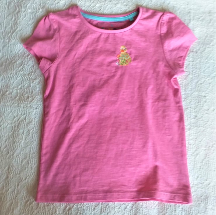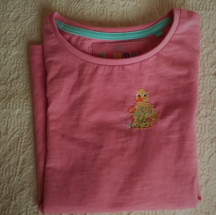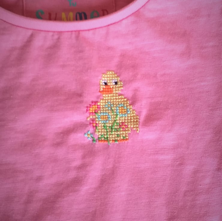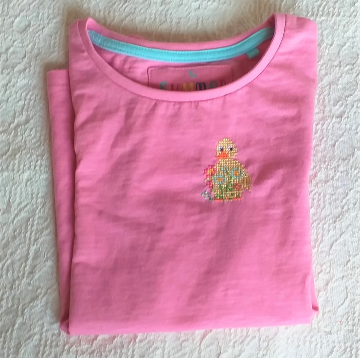 What a lovely Easter gift for a little girl! I have hand embroidered a little yellow duck with a spray of pink and light blue flowers on a pretty pink T-shirt by Tu. As I never use a permanent backing material when hand embroidering kids' clothing, there is nothing inside to irritate your child's skin. The shirt has short sleeves gathered at the shoulder, is 100% cotton and fully machine washable